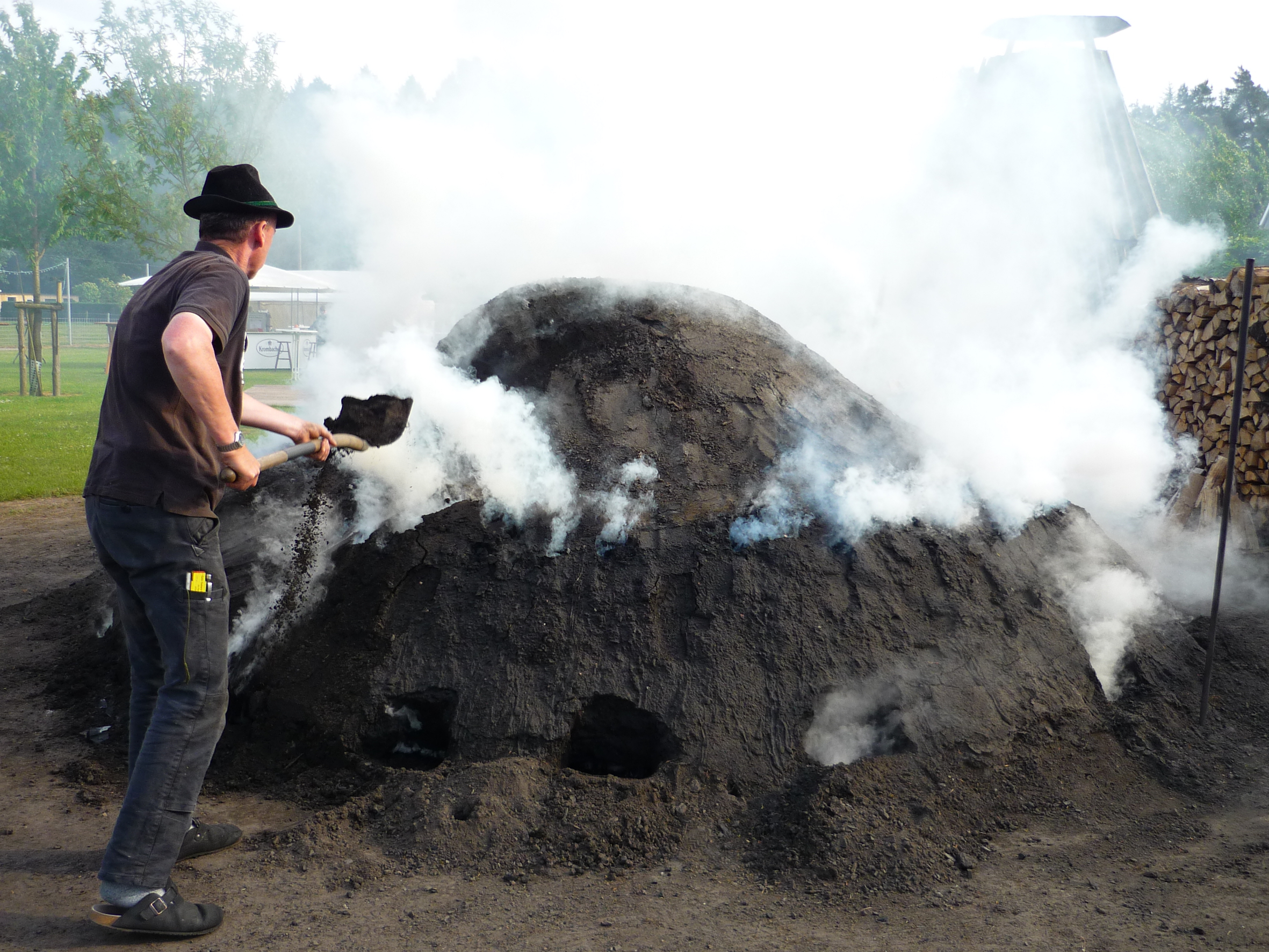 Die Köhlerei Reichswalde baut vom 29. Mai bis zum 9. Juni einen traditionellen Holzkohlemeiler im Niederrheinischen Freilichtmuseum auf. Foto: Köhlerei Reichswalde / Abdruck honorarfrei