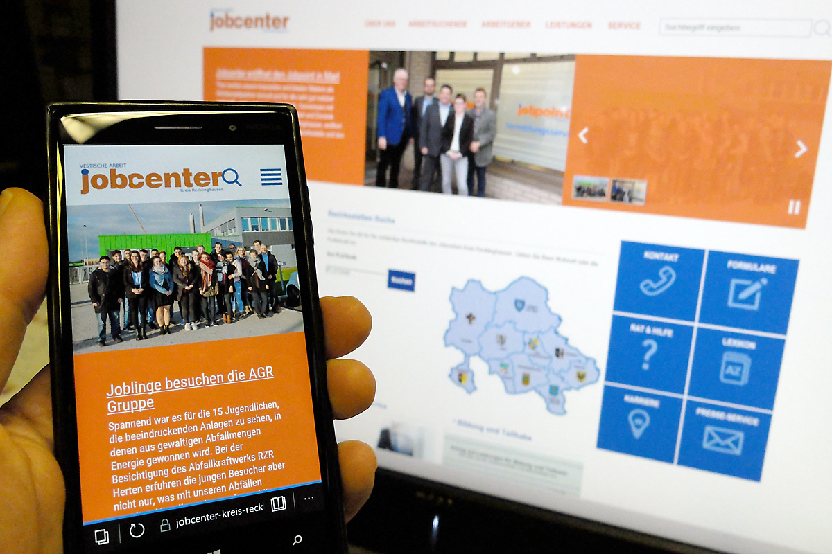 Die Internetseite des Jobcenters erkennt automatisch das Gerät, von dem aus sie aufgerufen wird, und passt die Darstellung an. So werden die Seiten für den PC, das Tablet oder das Smartphone optimiert angezeigt.