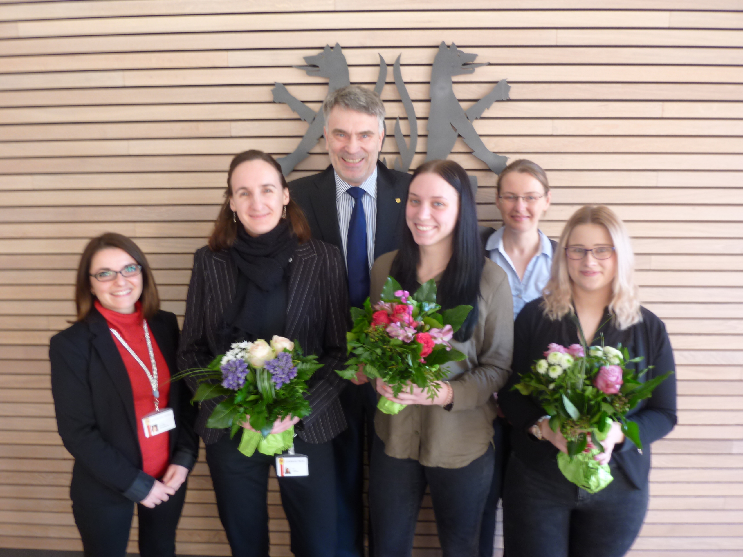 V.l.n.r.: Carmela Senatore (Personalrat), Kira Löhne, Erster Kreisrat Henning Heiß, Nadine Bewig, Nicole Papenberg (Ausbildungsleitung) und Larissa Lyzio