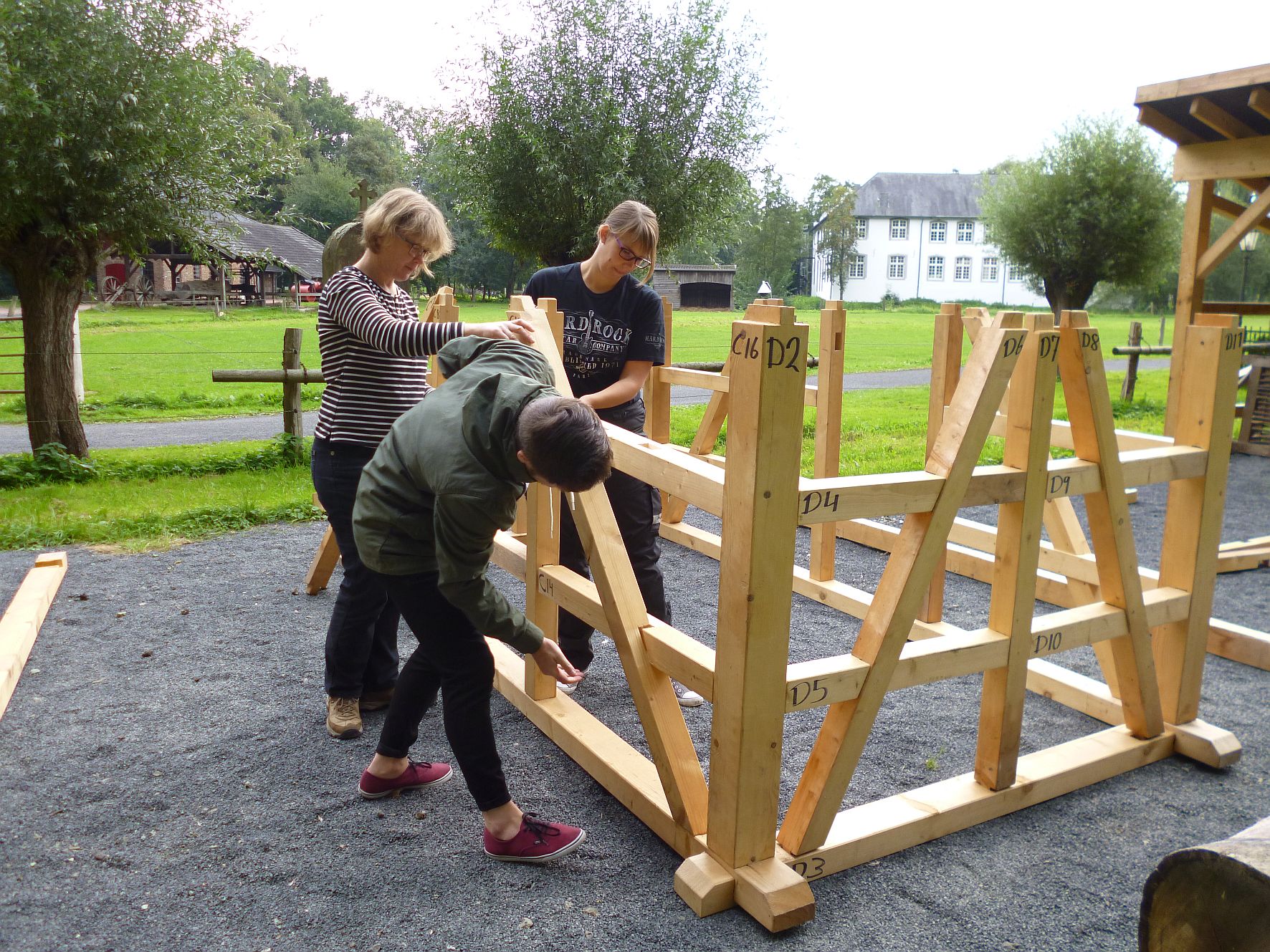 Besucher der Veranstaltung "KulturSingles" errichten gemeinsam ein Fachwerkhaus. Foto: Niederrheinisches Freilichtmuseum / Abdruck honorarfrei