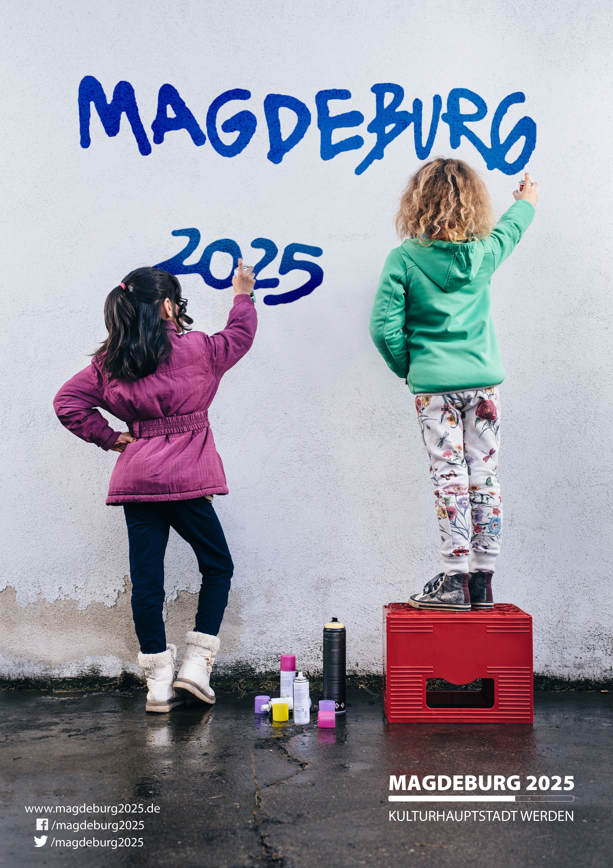 Aylar und Wanda (v.l.n.r.) sind in sieben Jahren 15 und 14 Jahre alt. Heute schreiben sie mit Kreidespray eine Vision an die Wand: Magdeburg 2025. Kulturhauptstadt werden. (Foto: Felix Paulin)