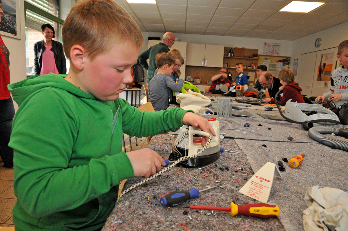 Der junge Marlin versucht sich bei der Tüftelkiste des ESB an einem alten Bügeleisen