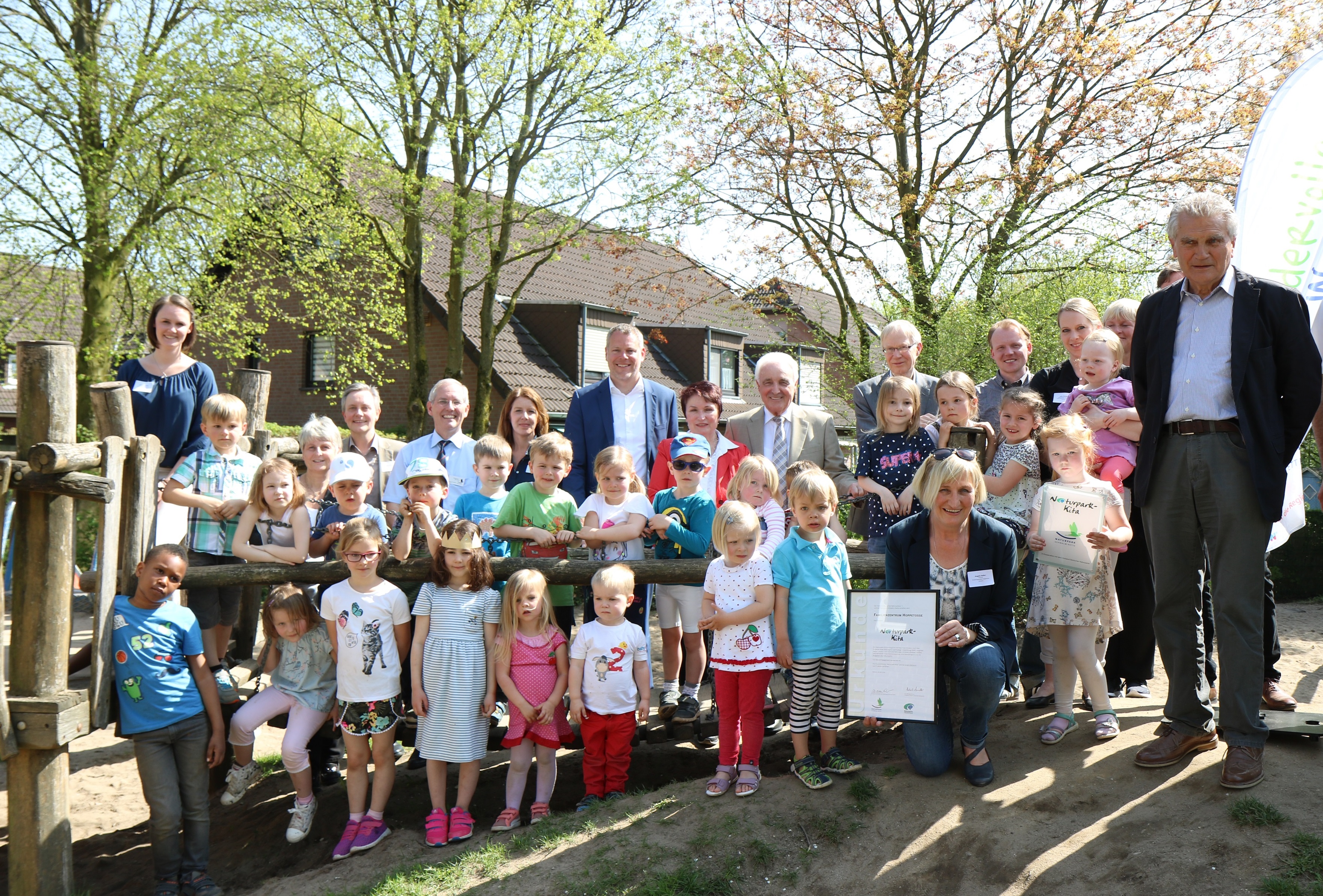 Die Kempener Hoppetosse ist erste Naturpark-Kita in NRW: Dr. Michael Arndt (vorne r.), Präsident des Verbands Deutscher Naturparke, Dr. Andreas Coenen (hinten Mitte), Verbandsvorsteher des Naturparks Schwalm-Nette, Hubert Kaiser (hinten 2.v.l.), Leiter der Forst- und Naturschutzabteilung im NRW-Umweltministerium und Dr. Ulrich Witte (hinten 3.v.r.), Abteilungsleiter Umweltkommunikation und Kulturgüterschutz der Deutschen Bundesstiftung Umwelt (DBU), gratulieren Kita-Leiterin Angela Haller (vorne mit Urkunde). Foto: Naturpark Schwalm-Nette / Abdruck honorarfrei