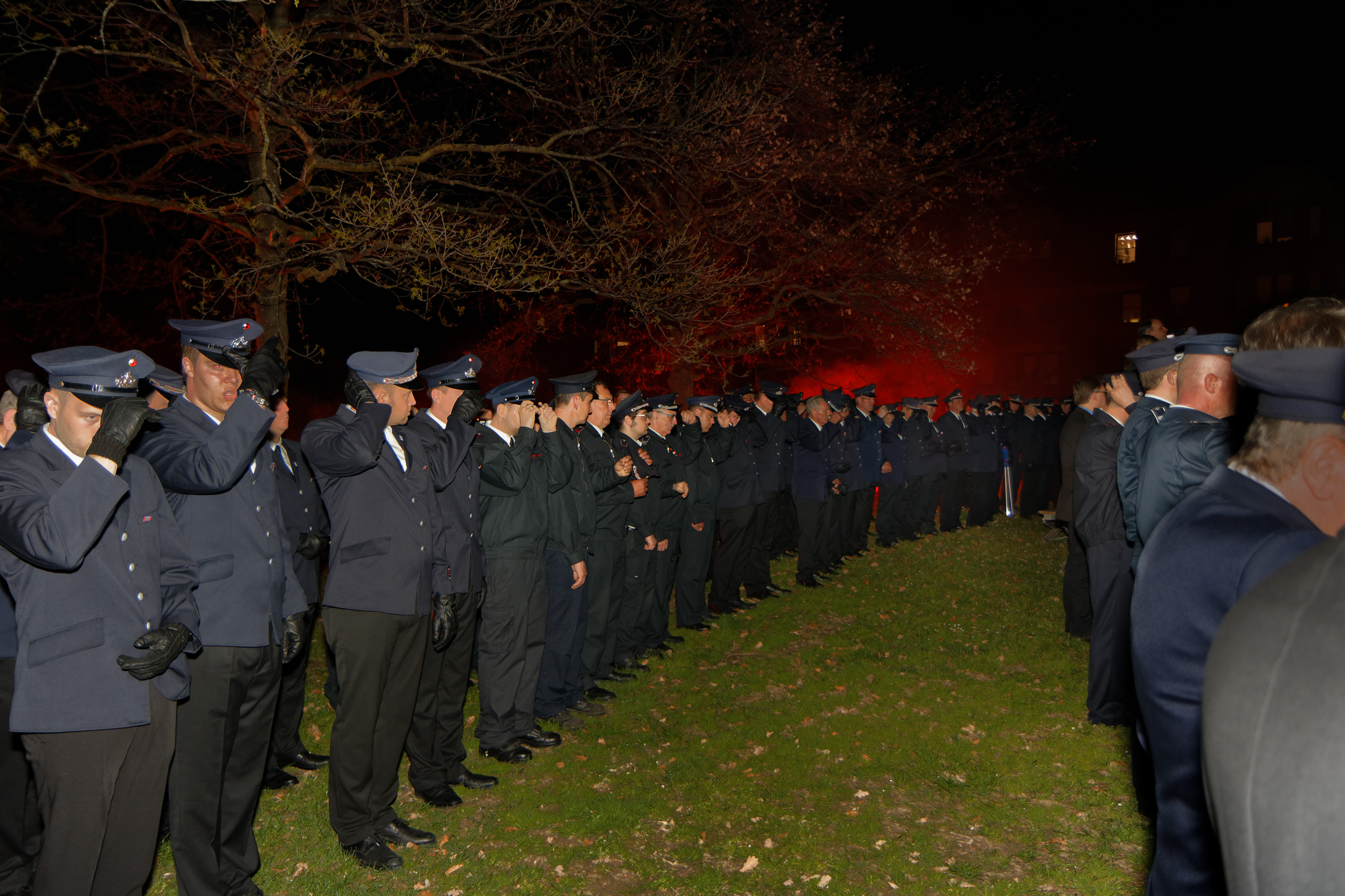 "Helm ab zum Gebet!" Der Festakt zur Verabschiedung von Kreisbrandmeister Klaus-Thomas Riedel endete mit einem großen Zapfenstreich der Feuerwehren aus dem Kreis Viersen. Foto; Kreis Viersen / Abdruck honorarfrei