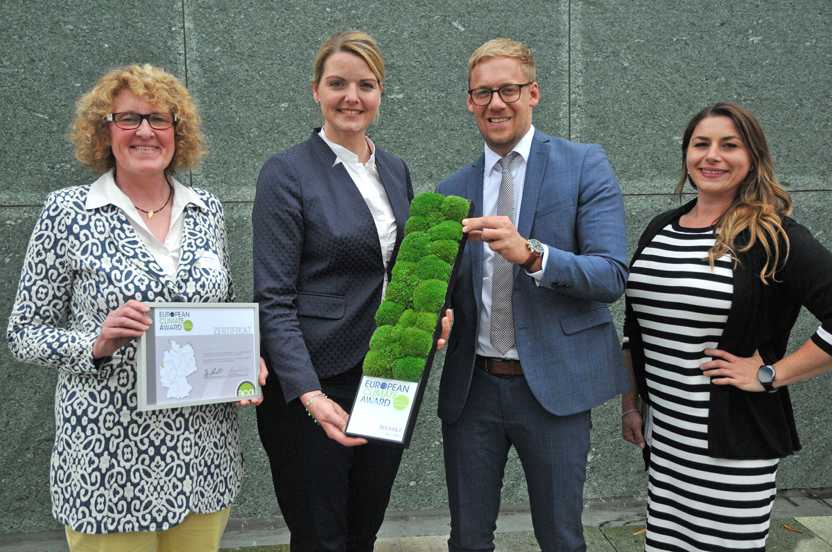 Den "European Climate Award" erhielt Stadtbaurat Daniel Zöhler (2.v.r.) als Vertreter der Stadt Bocholt heute aus den Händen von Christina Schulze Föcking, Ministerin für Umwelt, Landwirtschaft, Natur- und Verbraucherschutz des Landes NRW überreicht. Umweltreferntin Angela Theurich (links) und Klimaschutzmanagerin Karolina Theissen freuen sich über die Auszeichung.