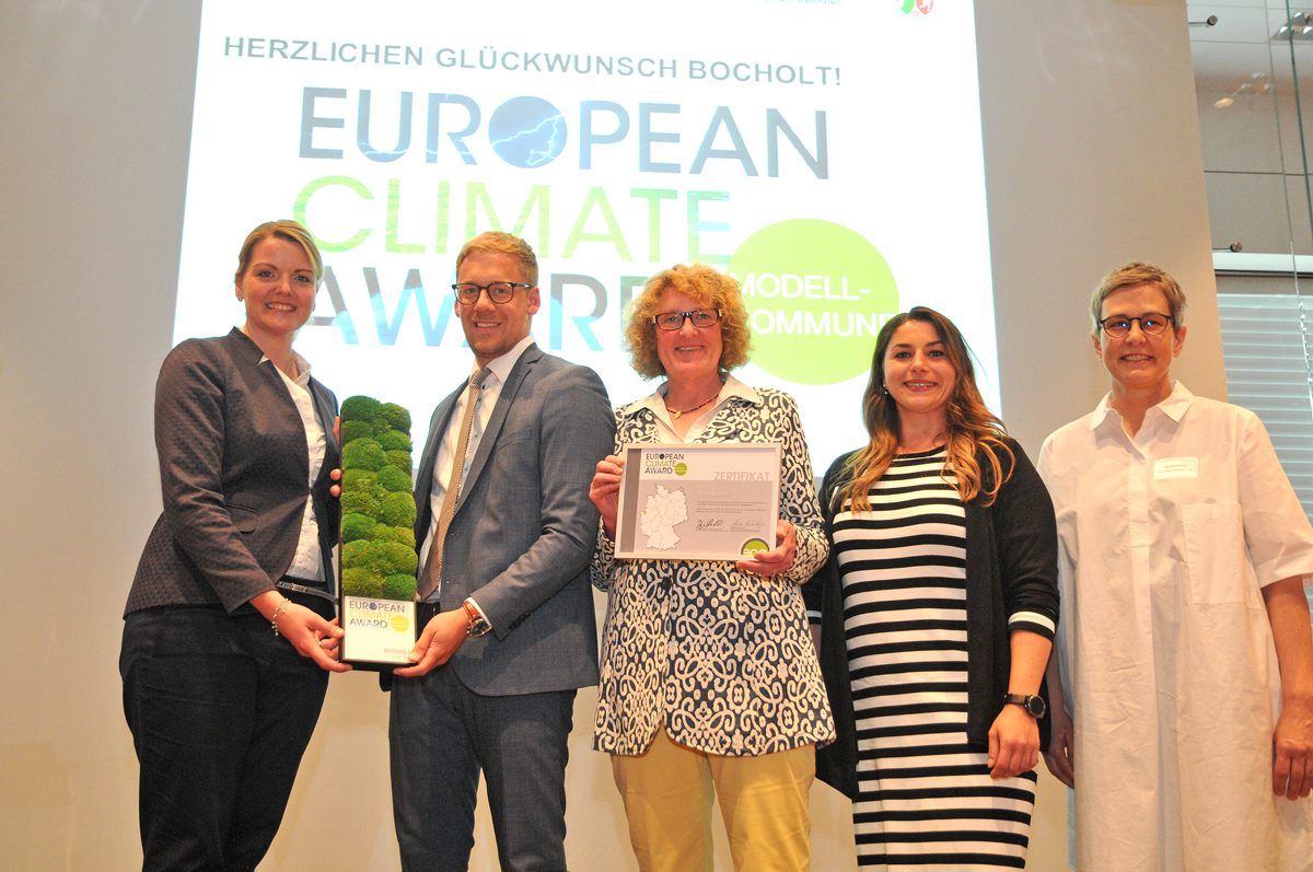 Herzlichen Glückwunsch Bocholt! NRW Umweltministerin Christina Schulze Föcking (li) überreichte Bocholts Stadtbaurat Daniel Zöhler den eca, Umweltreferentin Angela Theurich (Mitte) und Klimaschutzmanagerin Karolina Theissen (2.v.r.) freuen sich über die Auszeichnung.