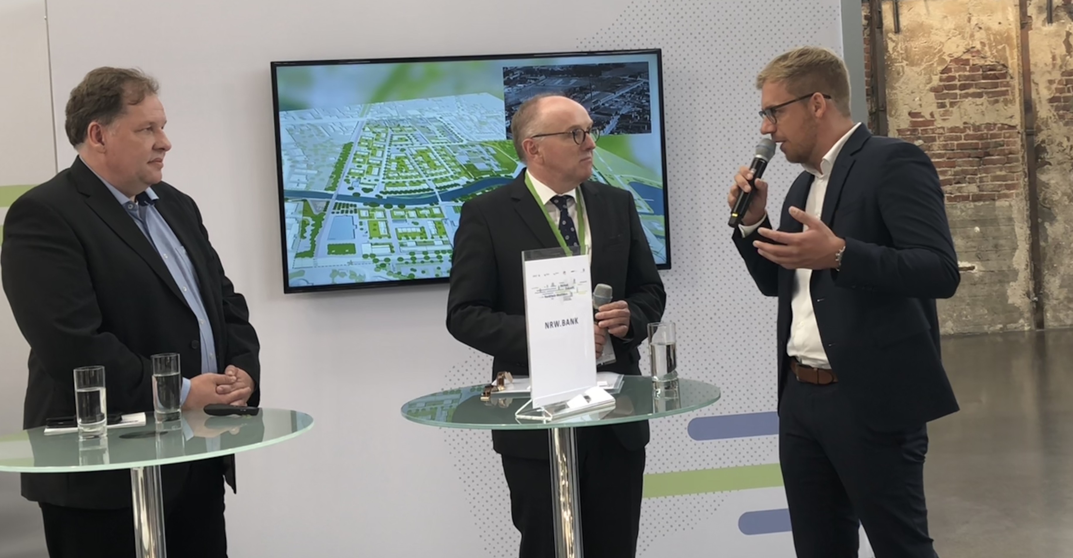 SQB-Geschäftsführer Peter Tautz (links) und Stadtbaurat Daniel Zöhler (rechts) in Diskussion mit Moderator Dr. Jörg Hopfe (NRW.Bank).