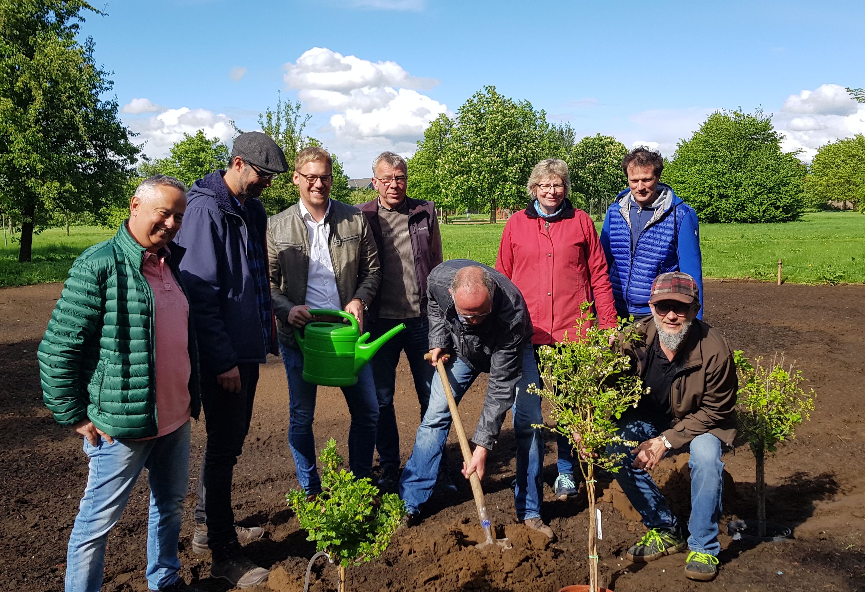 Michael Kempkes, Nabu (2. v. li.) Stadtbaurat Daniel Zöhler (3. v. li.), Fachbereichsleiter Reinhold Wilke (mit Schaufel) und Torsten Wollberg (Verein "Essbare Stadt, Projektkoordinator) freuen sich mit allen Beteiligten über den Start der "Essbaren Stadt" im Klostergarten.