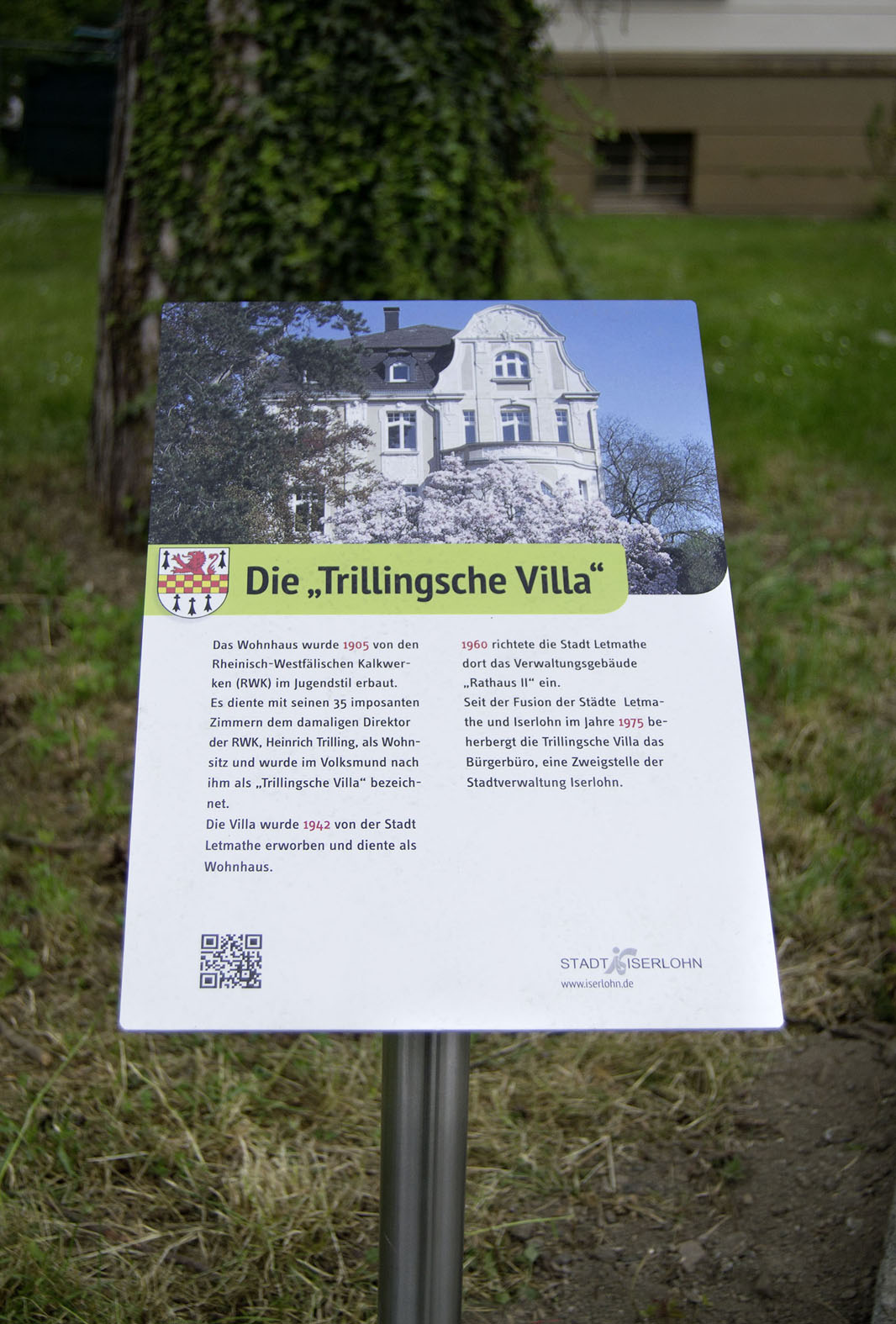 Insgesamt siebzehn dieser Tafeln, wie an der Trillingschen Villa vorgestellt, werden künftig historische Gebäude, Orte und Ereignisse in Letmathe beschreiben.