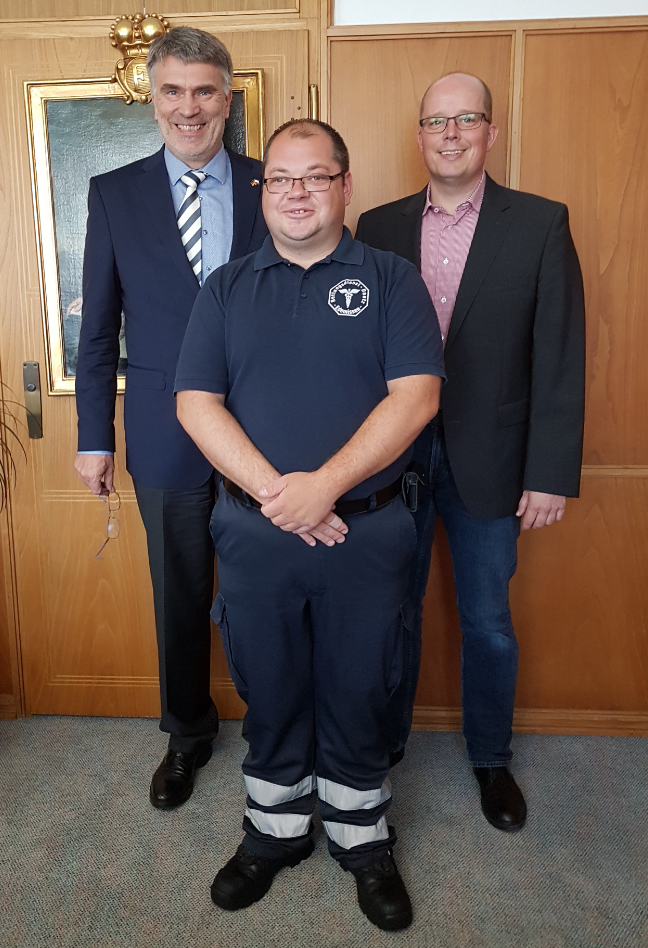 Auf dem Foto v.l.n.r.: Erster Kreisrat Henning Heiß, Daniel Wurzler (Organisatorischer Leiter Rettungsdienst), Hendrik Voges (Ärztlicher Leiter Rettungsdienst)