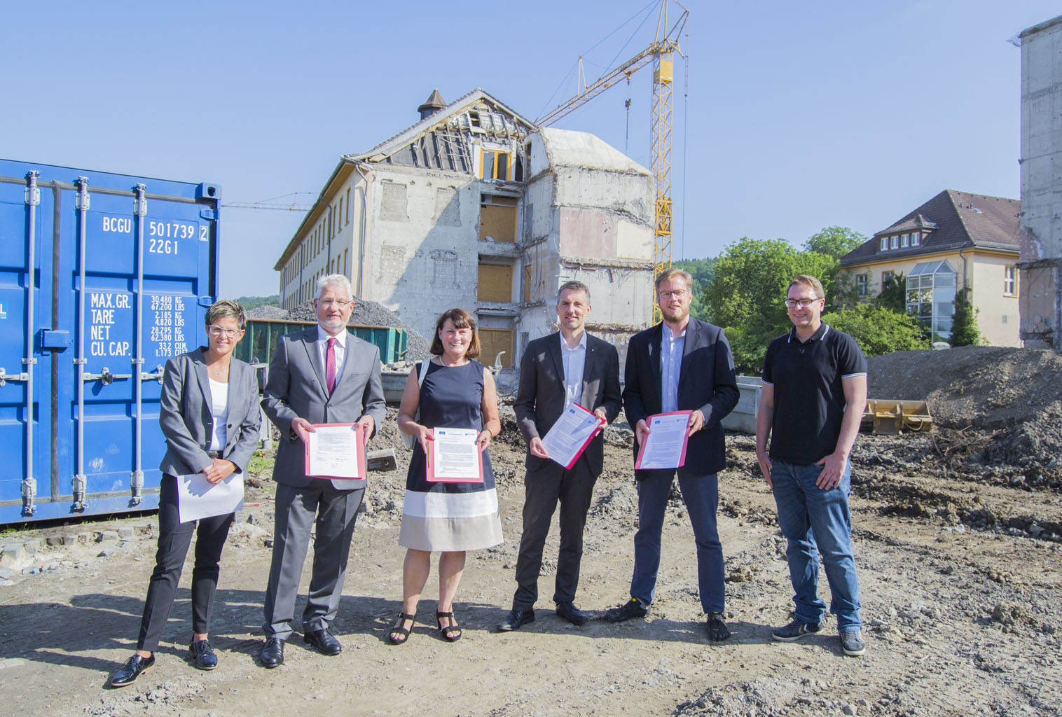 Gruppenfoto auf der Baustelle der Gesamtschule Seilersee nach Unterzeichnung der Kooperationsvereinbarung (v.l.): Sarah Schäfer, Prof. Dr.-Ing. Günther Philipp und Delia Imhoff von der Firma Thiele, Martin Stolte, Leiter des städtischen Ressorts Generationen und Bildung, Schulleiter Daniel Asmuth und Studien- und Berufsorientierungsbeauftragter Alexander Simon von der Gesamtschule Seilersee.