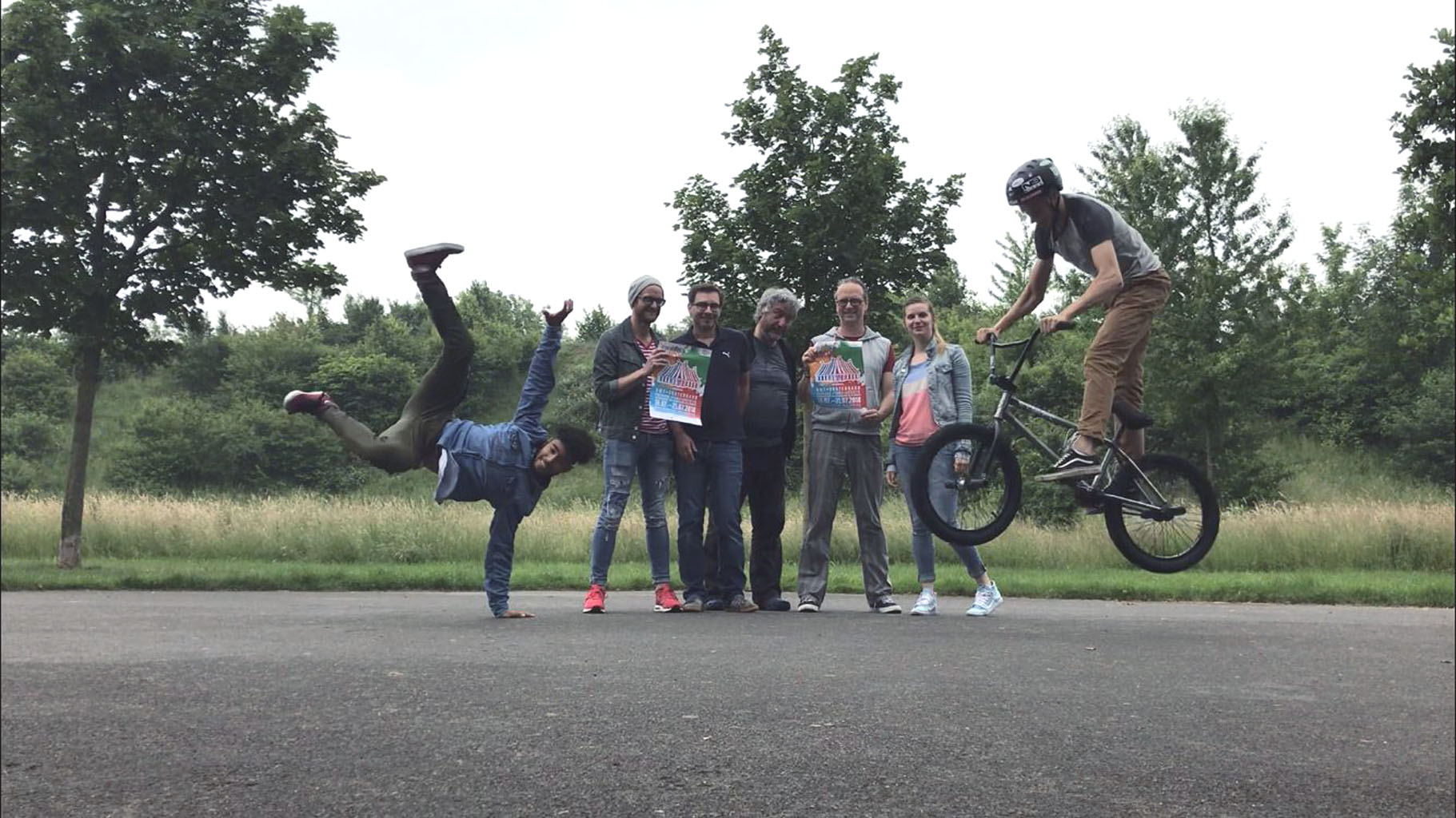 Patrick Jung (Handstand), René Zeiler, David Bastian, Frank Müller, Bernd Schulte und Sonja Mehlich von der städtischen Jugendarbeit sowie Felix Boll (BMX) laden zum „StreetArtCircus“ 2018 ein und freuen sich auf viele Teilnehmer.
