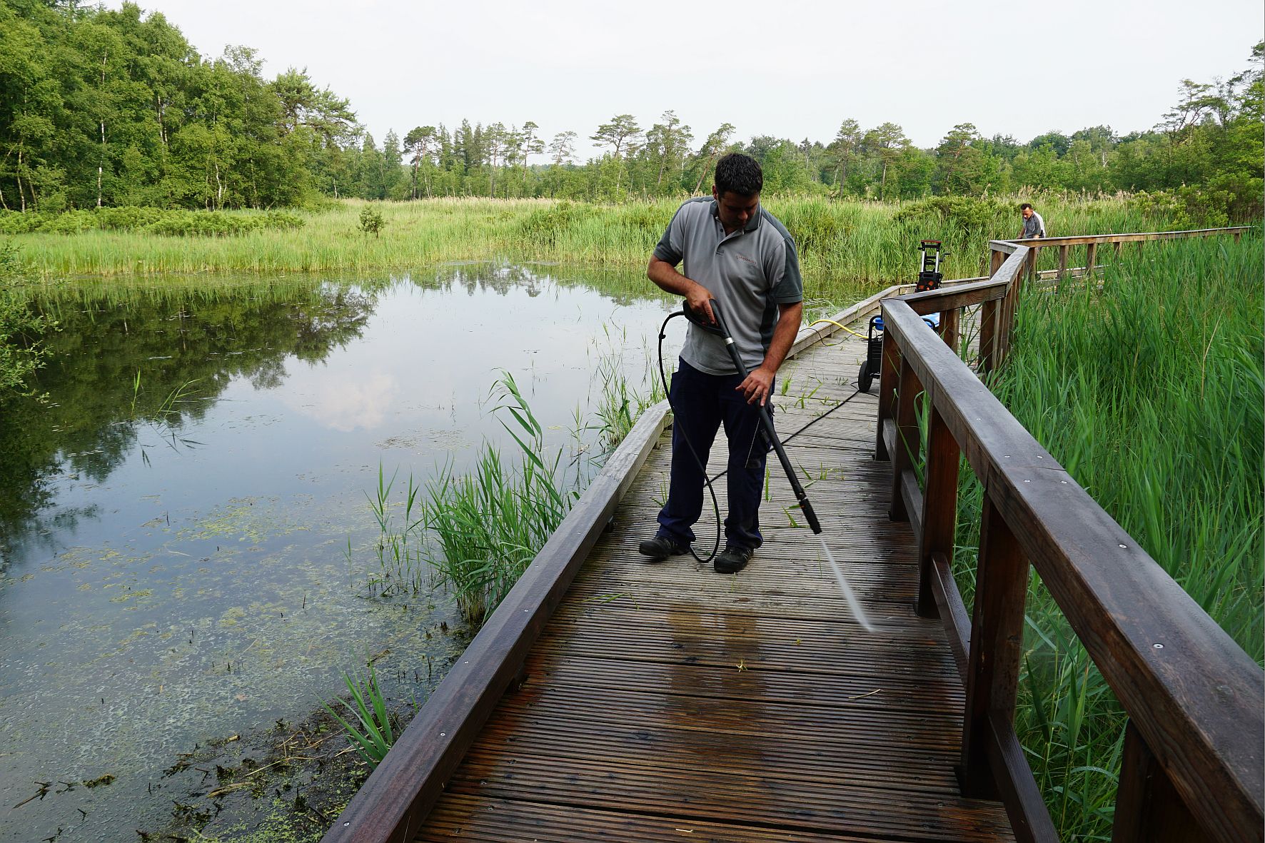 Vom Naturpark Schwalm-Nette beauftragte Mitarbeiter der Firma Ludwigs reinigen den Holzbohlensteg am Elmpter Schwalmbruch mit einem Hochdruckreiniger. Foto: Naturpark-Schwalm-Nette / Abdruck honorarfrei