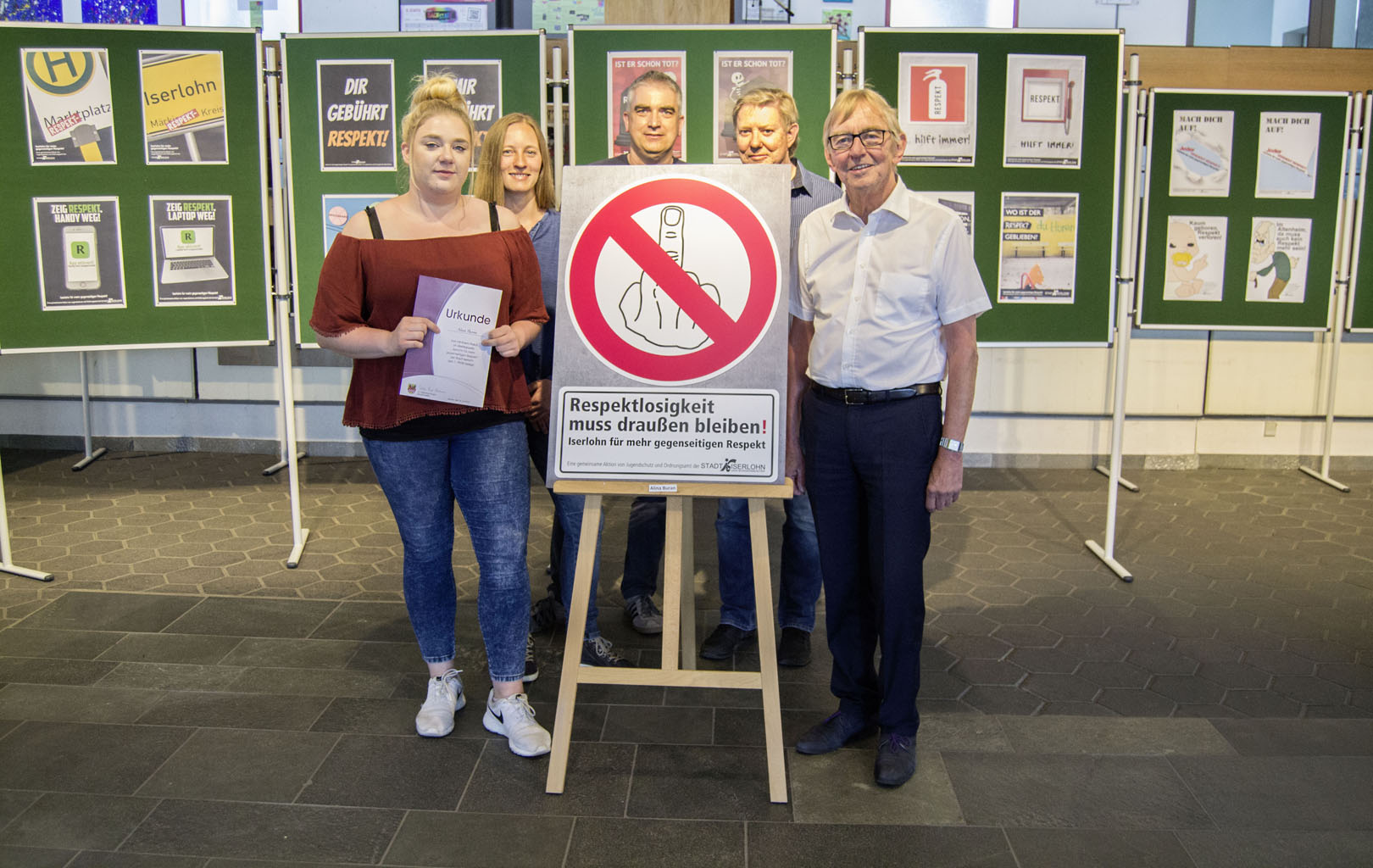 Im Rahmen der Eröffnung der Ausstellung präsentierten die Gewinnerin des Plakatwettbewerbes Alina Buran, Diana Wilke und Holger Albertini (Berufskolleg MK), Jürgen Lensing (Jugendschutz der Stadt Iserlohn) und Bürgermeister Dr. Peter Paul Ahrens (v.l.) das Siegerplakat.