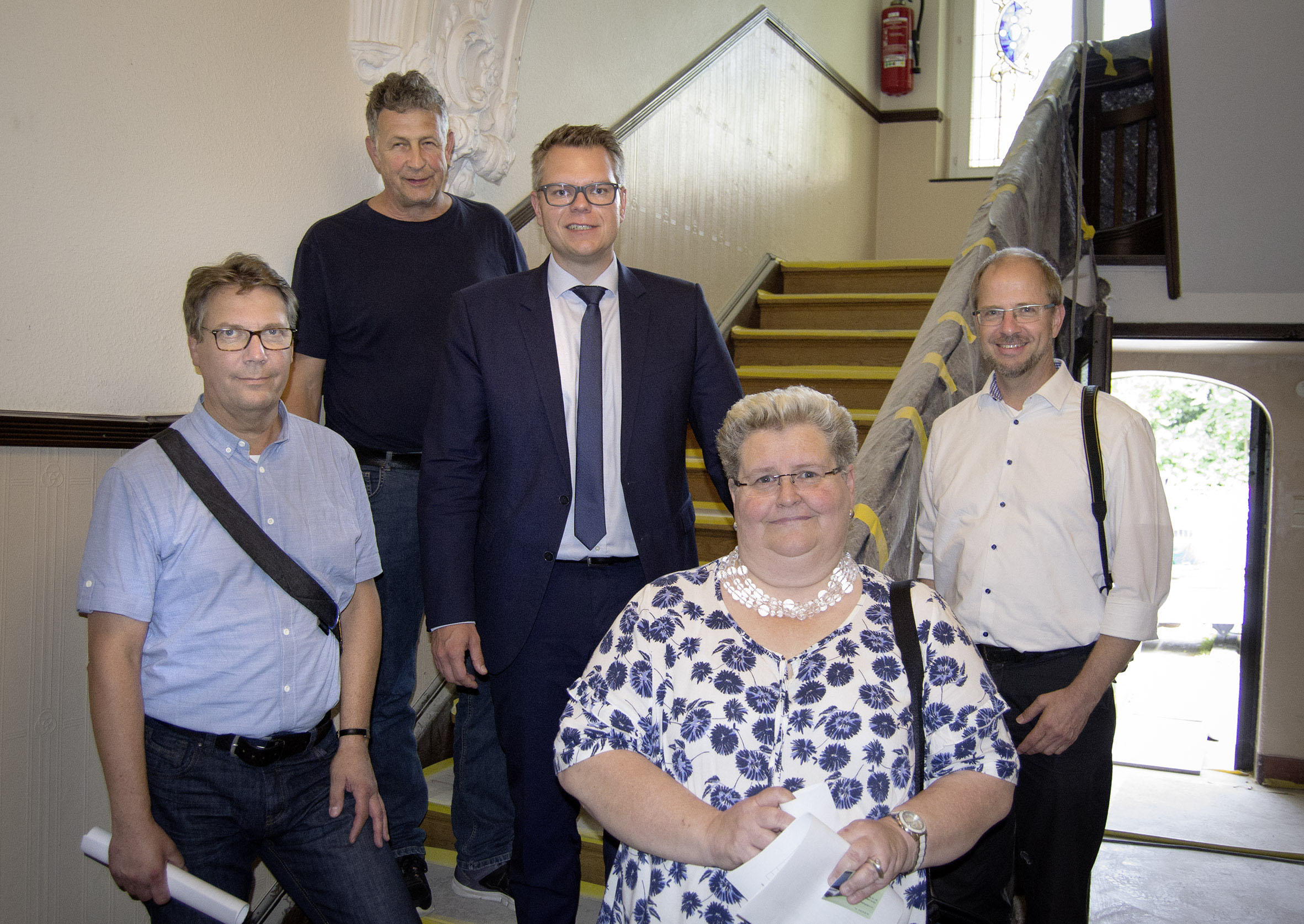 Udo Seegers (Miele Architekten), Projektleiter Hermann Noll (KIM), Stadtbaurat Mike-Sebastian Janke und KIM-Leiterin Claudia Zawada (v.l.) erläuterten den Umbau der Trillingschen Villa. Wenn die Arbeiten planmäßig im Dezember beendet sind, kann Musikschulleiter Paul Breidenstein (r.) mit seinem Team der Zweigstelle Letmathe den Einzug ins neue Domizil in Angriff nehmen.
