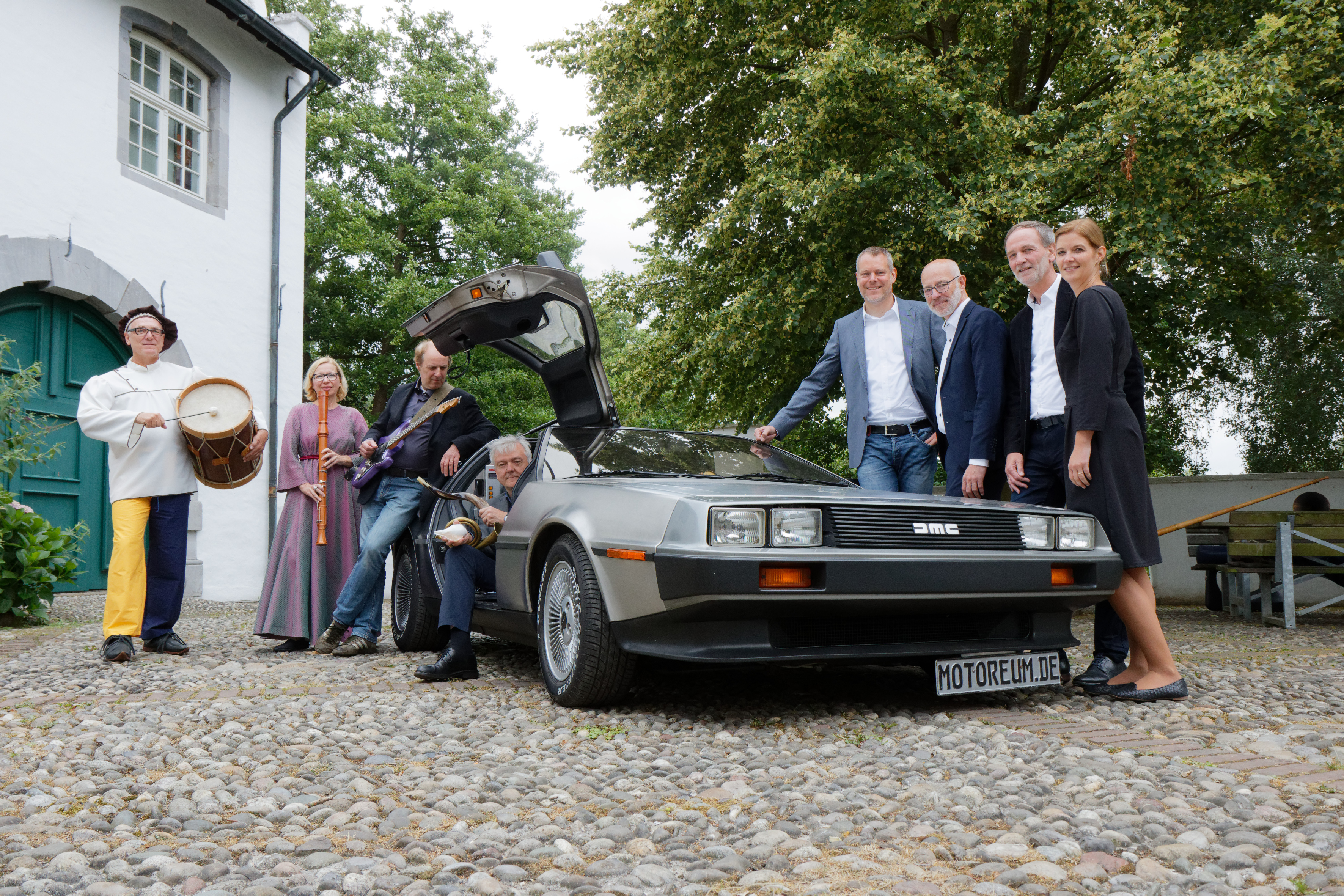 Laden zur Zeitreise mit Musi, Schauspiel und Genuss ein und testen das Fahrgefühl im DeLorean aus dem Film "Zurück in die Zukunft (v.l. hinter dem Auto) Landrat Dr. Andreas Coenen, Kutlurdezernent und Kreisdirektor Ingo Schabrich, Kreismusikschul-Leiter Ralf Holtschneider, Museumsleiterin Anke Wielebski. Für Musik sorgen unter anderem (v.l. m. Instrumenten) : Erik Moller (Landsknechtstrommel), Simone Moller (Baßblockflöte), Christian Kiefer (E-Gitarre) und Wilhelm Junker (Naturhorn). Foto: Kreis Viersen / Abdruck honorarfrei