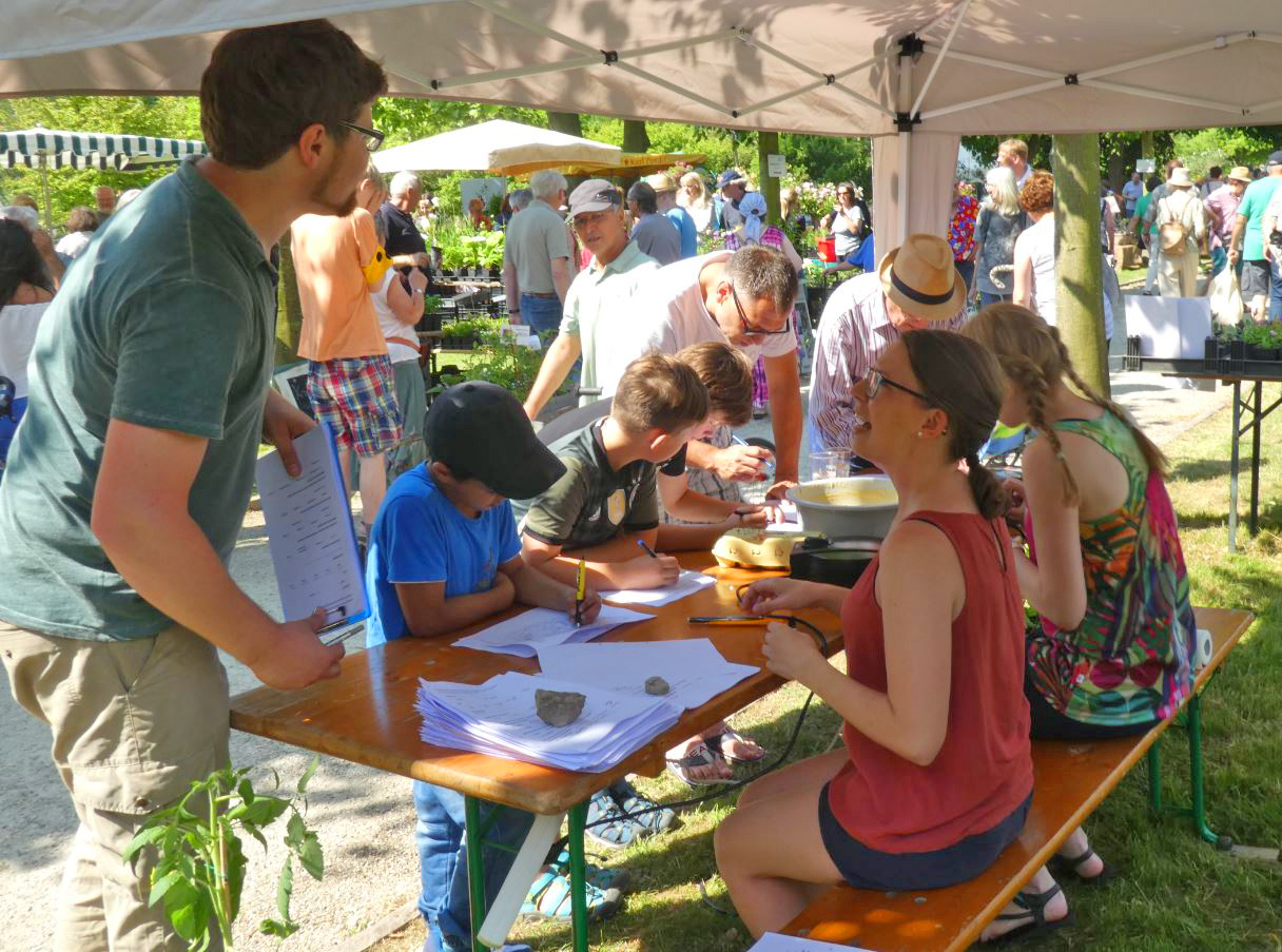 Studentinnen und Studenten des Fachbereichs Architektur, Stadt- und Landschaftsplanung der Uni Kassel bei einer Umfrage zur Entwicklung des Botanischen Gartens bei der Pflanzenbörse im Frühling.