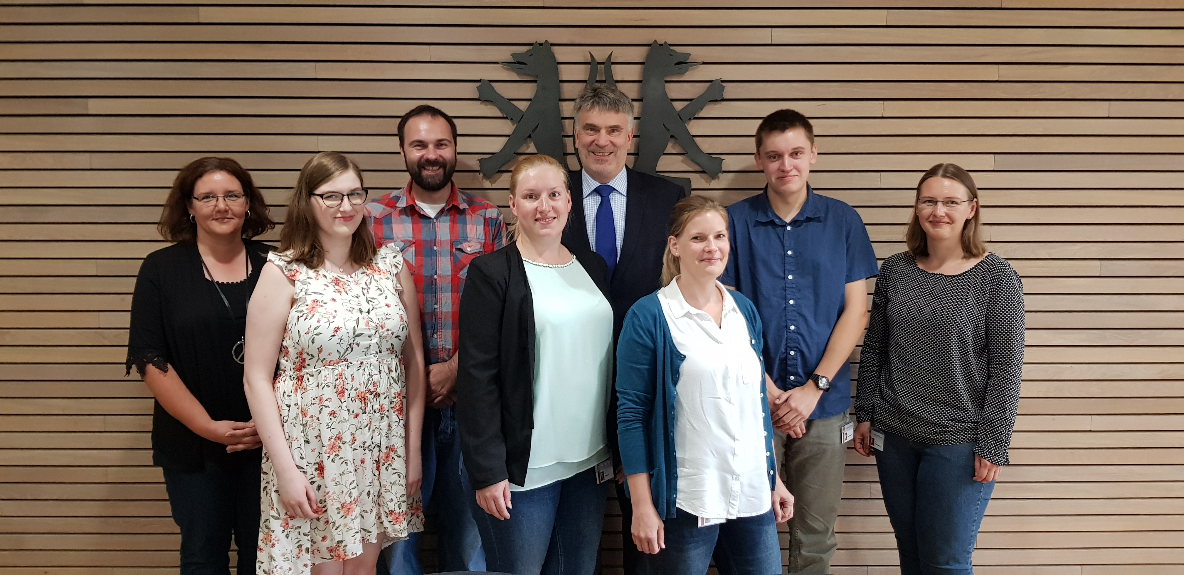 Das Bild zeigt vorne v.l. Laura Hübner, Sarah Tomalik und Juliane Schell; hinten v.l. Pamela Gelbke (Ausbildungsbeauftragte), Benjamin Dietrich, Erster Kreisrat Henning Heiß, Sven Braukmann und Nicole Papenberg (Ausbildungssachbearbeiterin).