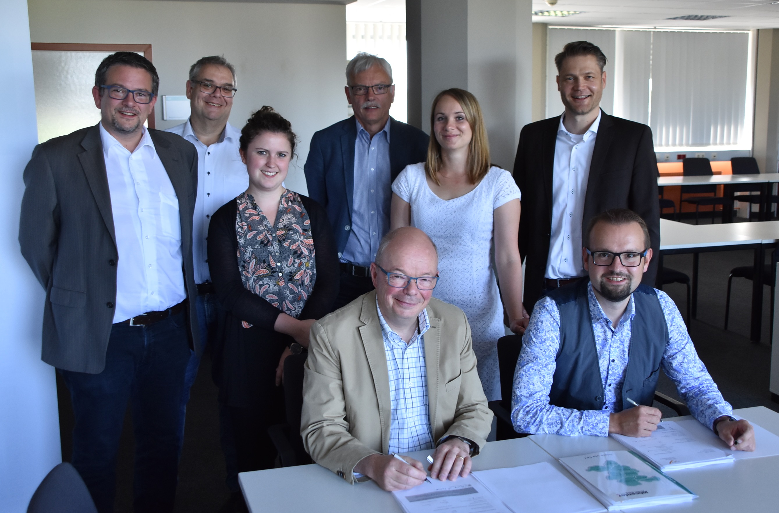 Unterzeichnung des gemeinsamen Projektantrags (v.l.): Carsten Taschner (Ressortleiter Markt & Integration, Jobcenter Kreis Recklinghausen), Michael Schmitz (Teamleiter Team Projekte, Jobcenter Rhein-Berg), Annika Linder (Integrationsfachkraft, Jobcenter Rhein-Berg), Johannes Breidenbach (Bereichsleiter Markt und Integration, Jobcenter Rhein-Berg), Michael Schulte (Geschäftsführer Jobcenter Rhein-Berg), Ksenia Reis (Drittmittel-Koordinatorin, Jobcenter Kreis Recklinghausen), Dominik Schad (Leiter Jobcenter Kreis Recklinghausen), Arne von Röpenack (Standortleiter Jobakademie Recklinghausen).