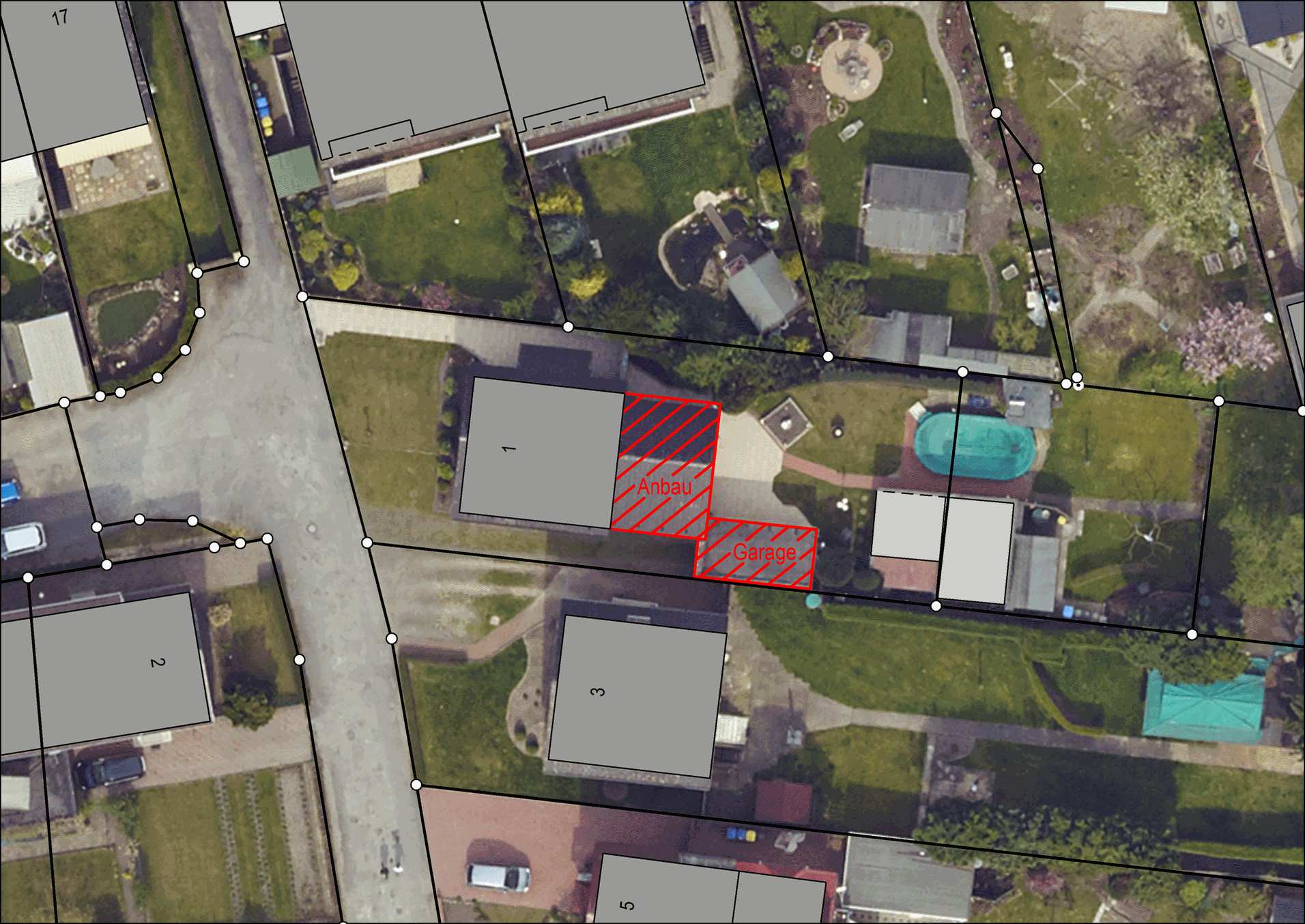 Bildzeile: So sieht es aus, wenn Luftbilder mit der Liegenschaftskarte abgeglichen werden: Der Anbau und die Garage sind noch nicht vermerkt und grau hinterlegt. Grafik Kreis Unna