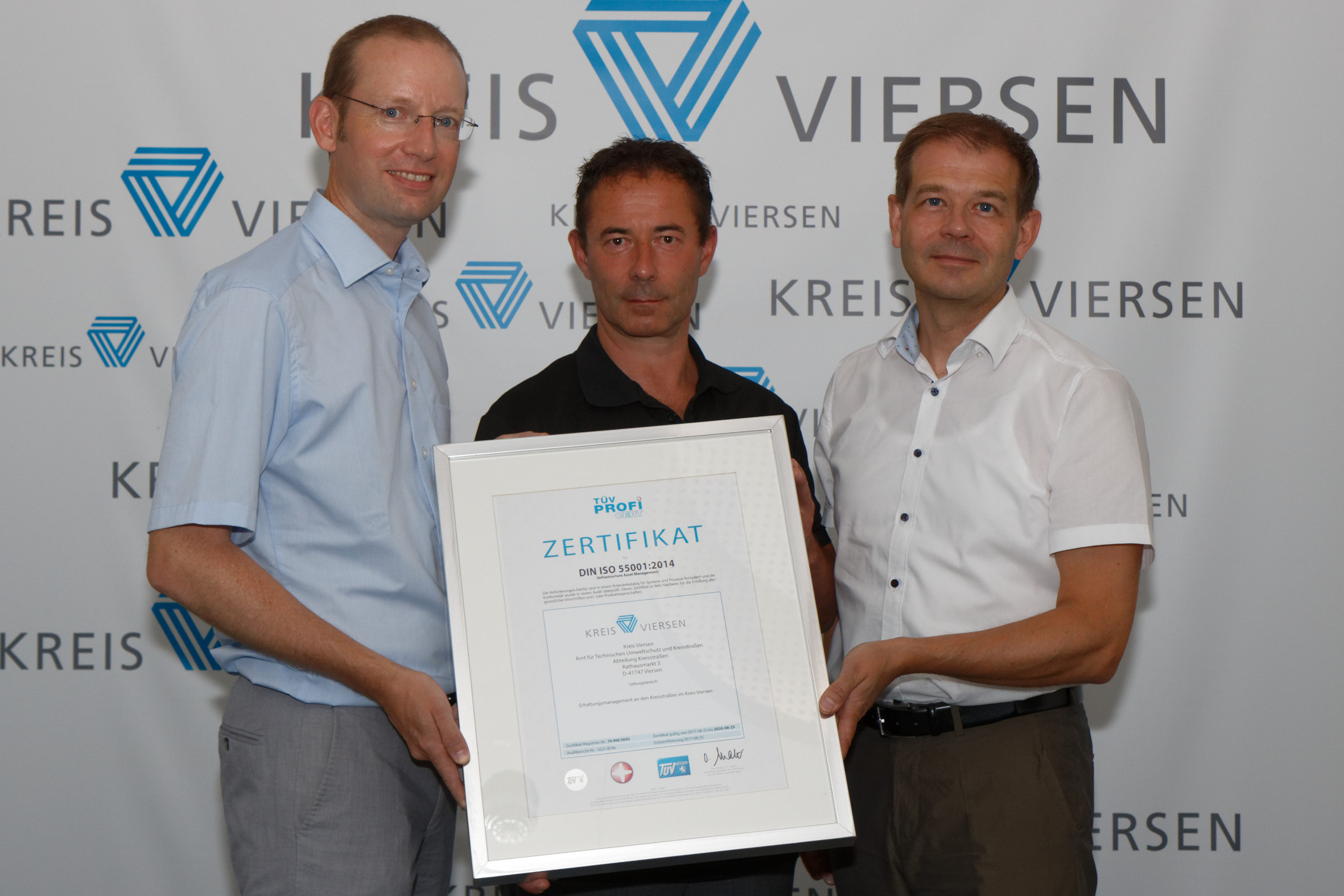 Gehen das Management der Kreisstraßen strategisch an: Technischer Dezernent Andreas Budde (r.), und Christian Böker, der stellvertretende Leiter des Amtes für Technischen Umweltschutz und Kreisstraßen (l.) mit TÜV-Auditor Steffen Heß (m.). Foto: Kreis Viersen / Abdruck honorarfrei