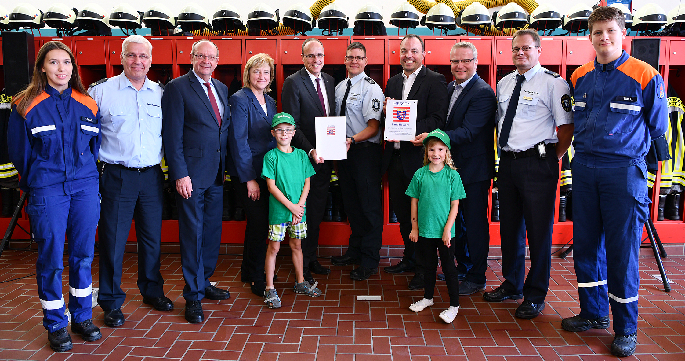 Übergabe Zuwendungsbescheid (v.l.n.r.) Lina Franz (Jugendfeuerwehr Wolfsanger), Norbert Schmitz (Leitender Branddirektor), Wolfgang Decker (MdL), Eva Kühne-Hörmann (Hessische Justizministerin), Alina (Löschzwerge), Peter Beuth (Hessischer Minister des Innern und Sport), Mathias Lehmann (Wehrführer), Christian Geselle (Oberbürgermeister), Leonard (Löschzwerge), Dirk Stochla (Brandschutzdezernent), Jörg Straßer (Stadtbrandinspektor), Tim Gebert (Jugendfeuerwehr Wolfsanger)