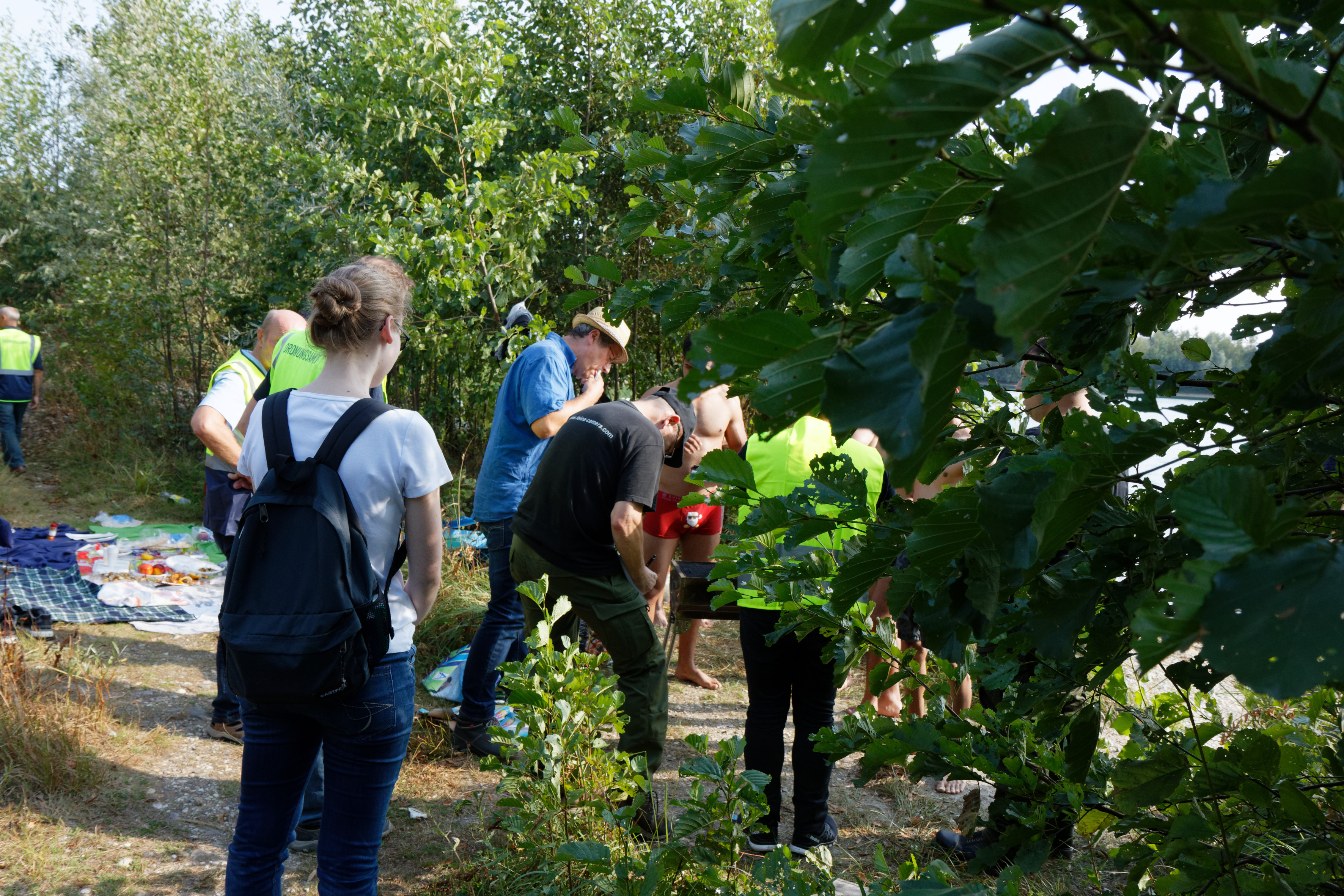Mitarbeiterinnen und Mitarbeiter des Kreises Viersen und der Stadt Kempen kontrollieren eine Gruppe junger Männer, die am Köngishüttesee . Für das Grillen und Lagern am See war ein Verwarnungsgeld von 50 Euro pro Person fälllig. Foto: Kreis Viersen / Abdruck honorarfrei
