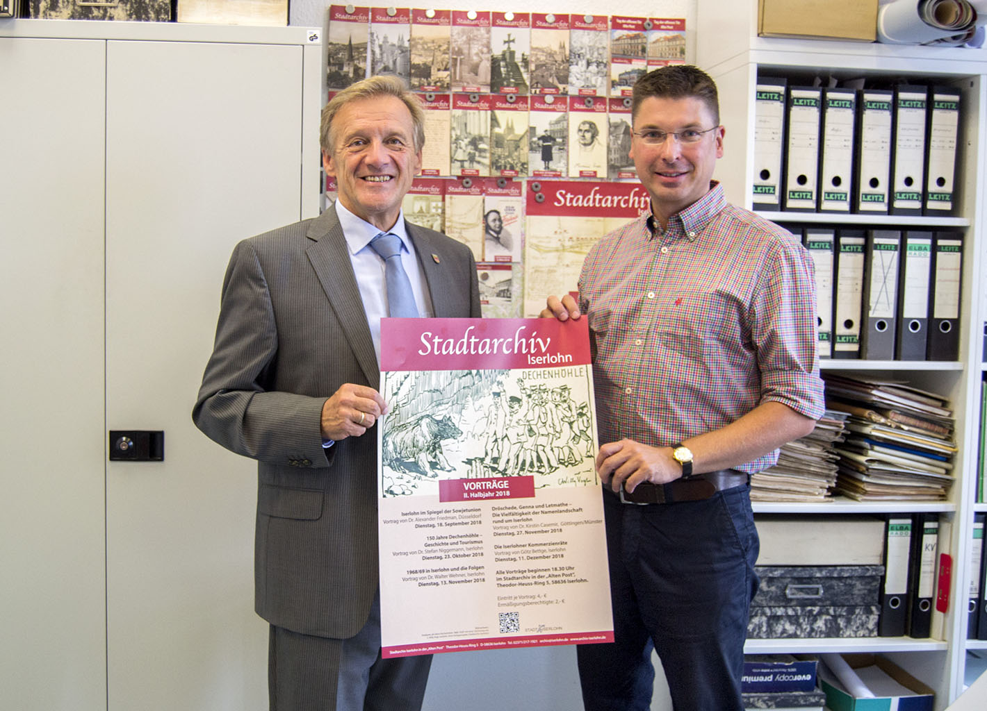 Ressortleiter Jochen Köhnke (l.) und Stadtarchivar Rico Quaschny präsentieren das Vortragsprogramm für das II. Halbjahr 2018.