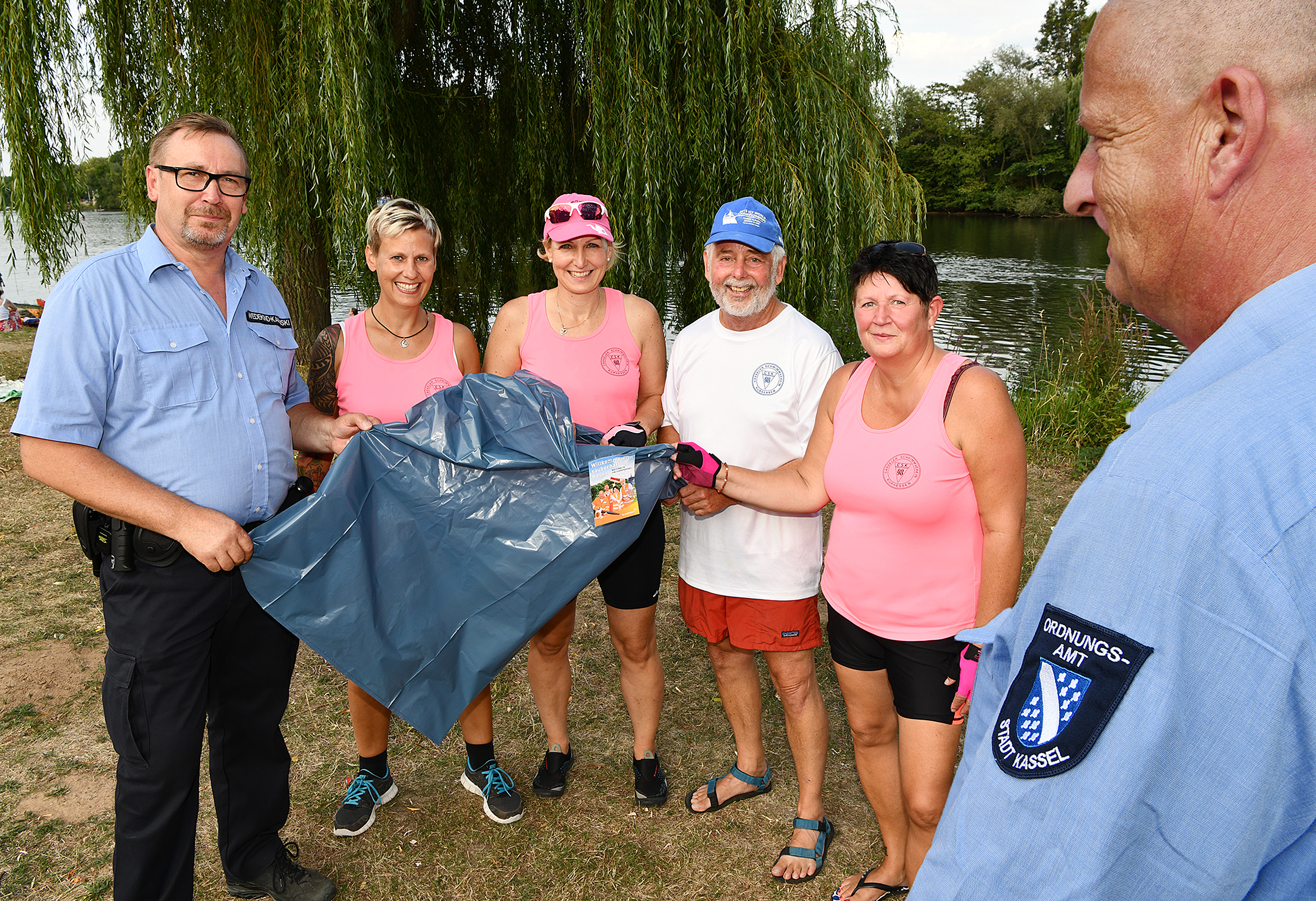 Riverside, Müllbeutel-Aktion, (v.l.n.r.) Lutz Wedekind-Kaminski (Ordnungsamt), Jennifer Arnold (CSK 98), Simone Brüßler (CSK 98), Jens Perlwitz (CSK 98), Silvia Schmitt (CSK 98), Dieter Eberhardt (Ordnungsamt)