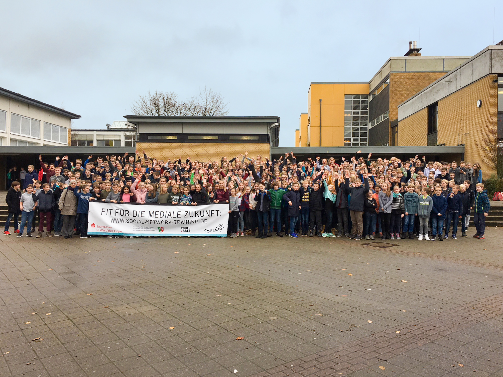 Die teilnehmenden Schülerinnen und Schüler des Projektes "Social Network Training" vom Gymnasium Remigianum in Borken freuen sich über das neue Gruppengefühl auf Basis von "Digitaler Zivilcourage".