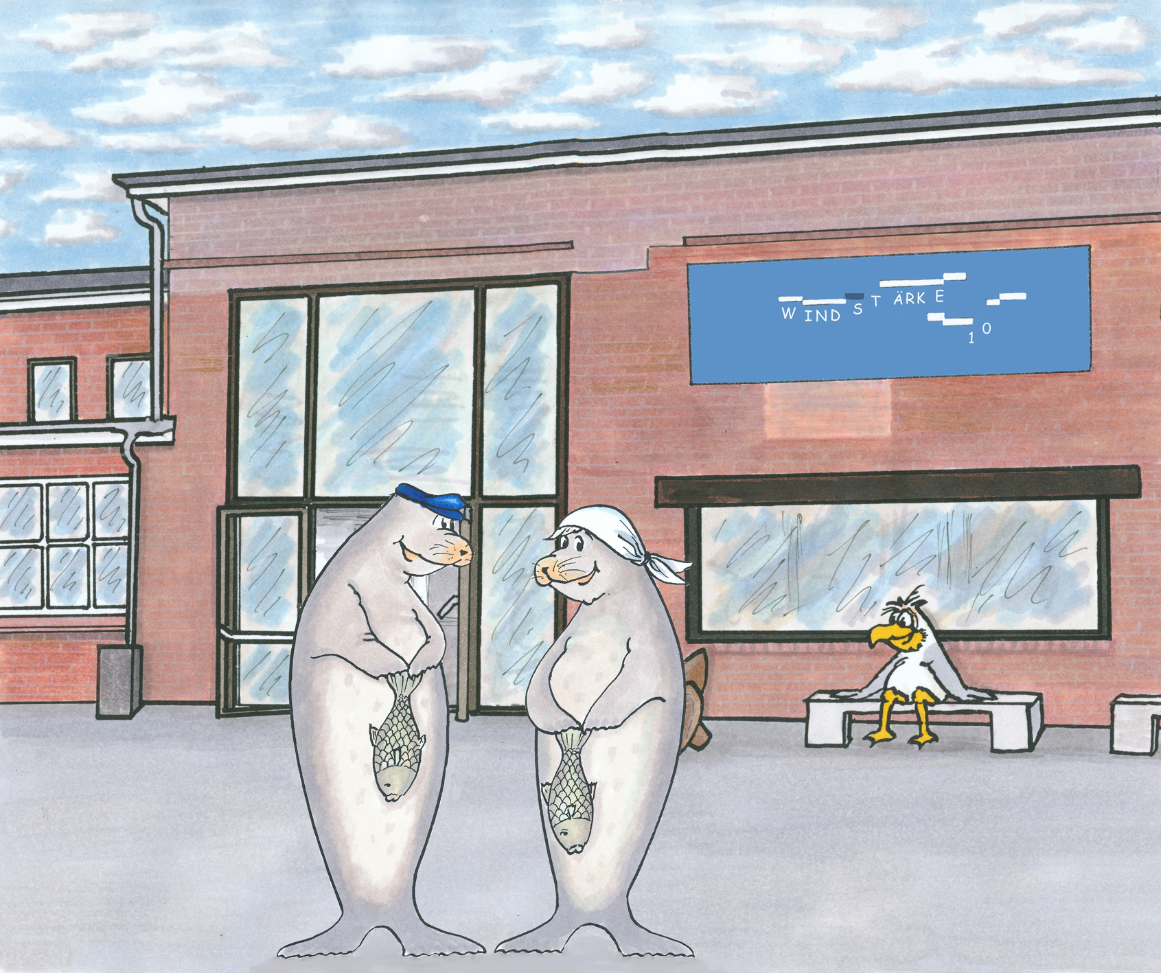 Die Cartoon-Robben "Freddi" und "Frieda" vor dem Museum "Windstärke 10"