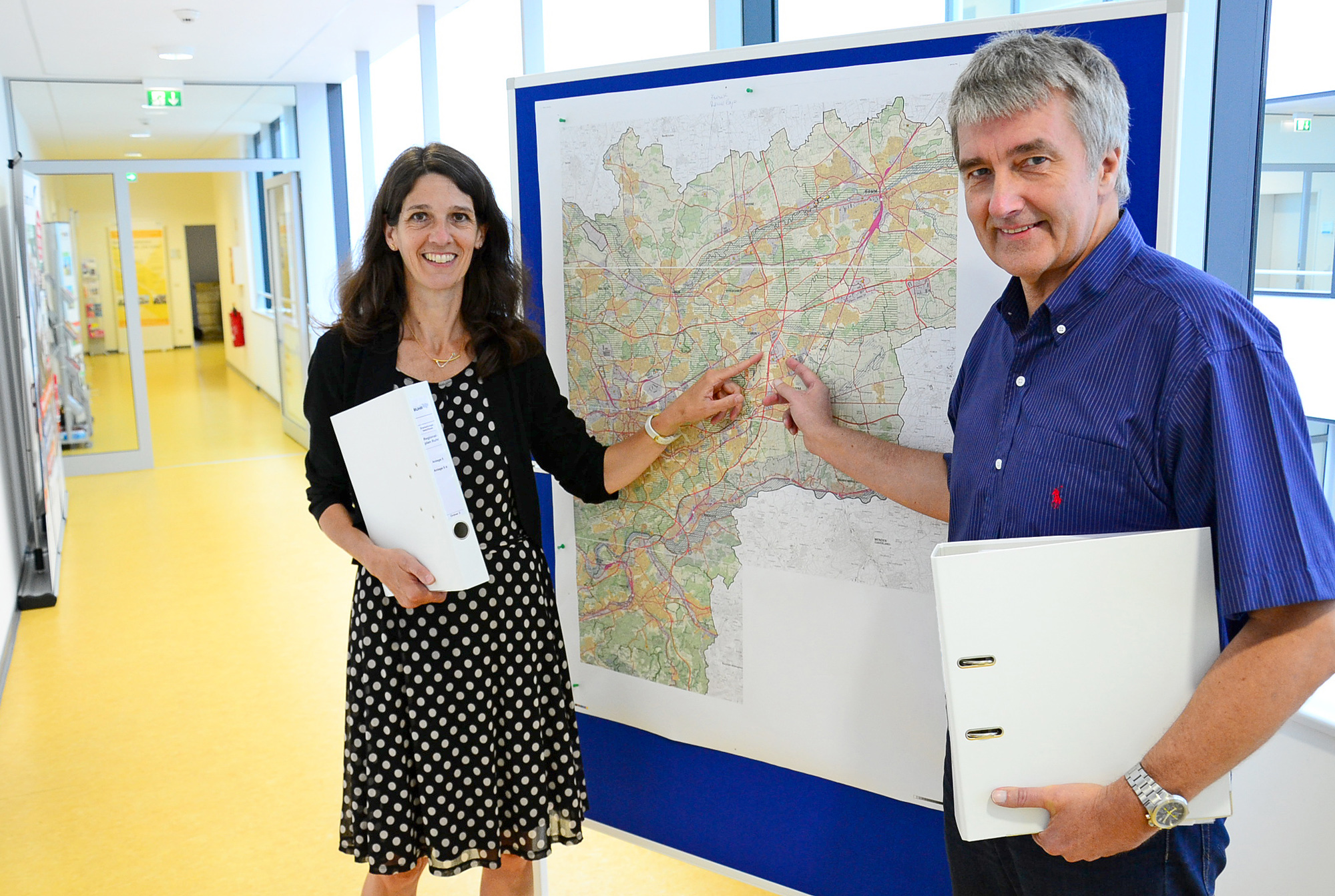 Bildzeile: Sabine Leiße, Leiterin der Stabsstelle Planung und Mobilität (l.) und Gert Kozik, Regional- und Bauleitplanung (r.) haben die Infos zum Plan. Foto: Max Rolke - Kreis Unna
