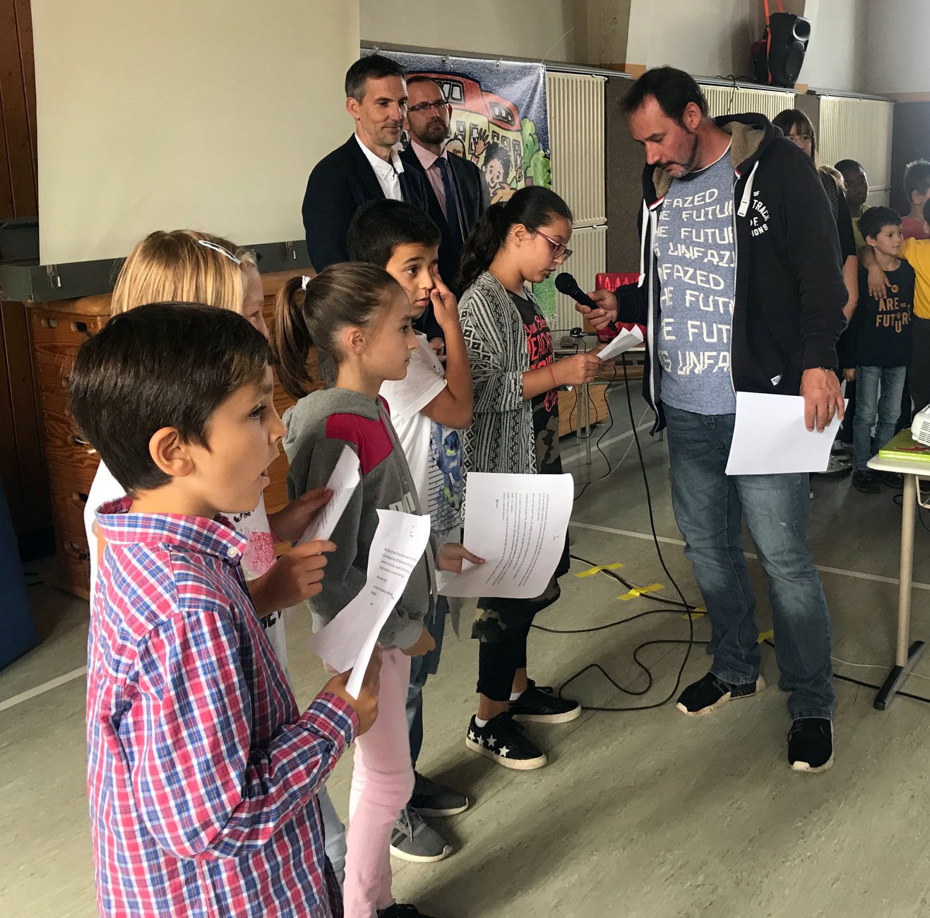Schülerinnen und Schüler der Südschule präsentieren die Ergebnisse ihrer Stadtforschungsarbeit. Martin Stolte und Thorsten Grote (hinten v.l.) werden die Anregungen und Wünsche mit in den Verwaltungsvorstand nehmen.