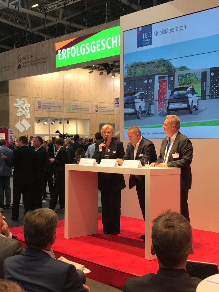 Das innovative neue Wohnquartier "Pioneer Park Hanau“ in Hanau stand im Mittelpunkt der öffentlichen Veranstaltung in der Metropolarena FrankfurtRheinMain mit dem Titel "Pioneer Park Hanau – Pionier bei Mobilität und Versorgung" (Montag, 8. Oktober 2018, 15.15–15.45 Uhr). Dr. Marc Weinstock, Geschäftsführender Gesellschafter der DSK | BIG Gruppe (mitte), Michael Lowak, Segment CEO Immobilienwirtschaft der GETEC Group und Erika Schulte, Geschäftsführerin der Hanau Wirtschaftsförderung GmbH präsentierten den Wohnpark der Zukunft, der in Hanau in den kommenden Jahren gebaut wird.