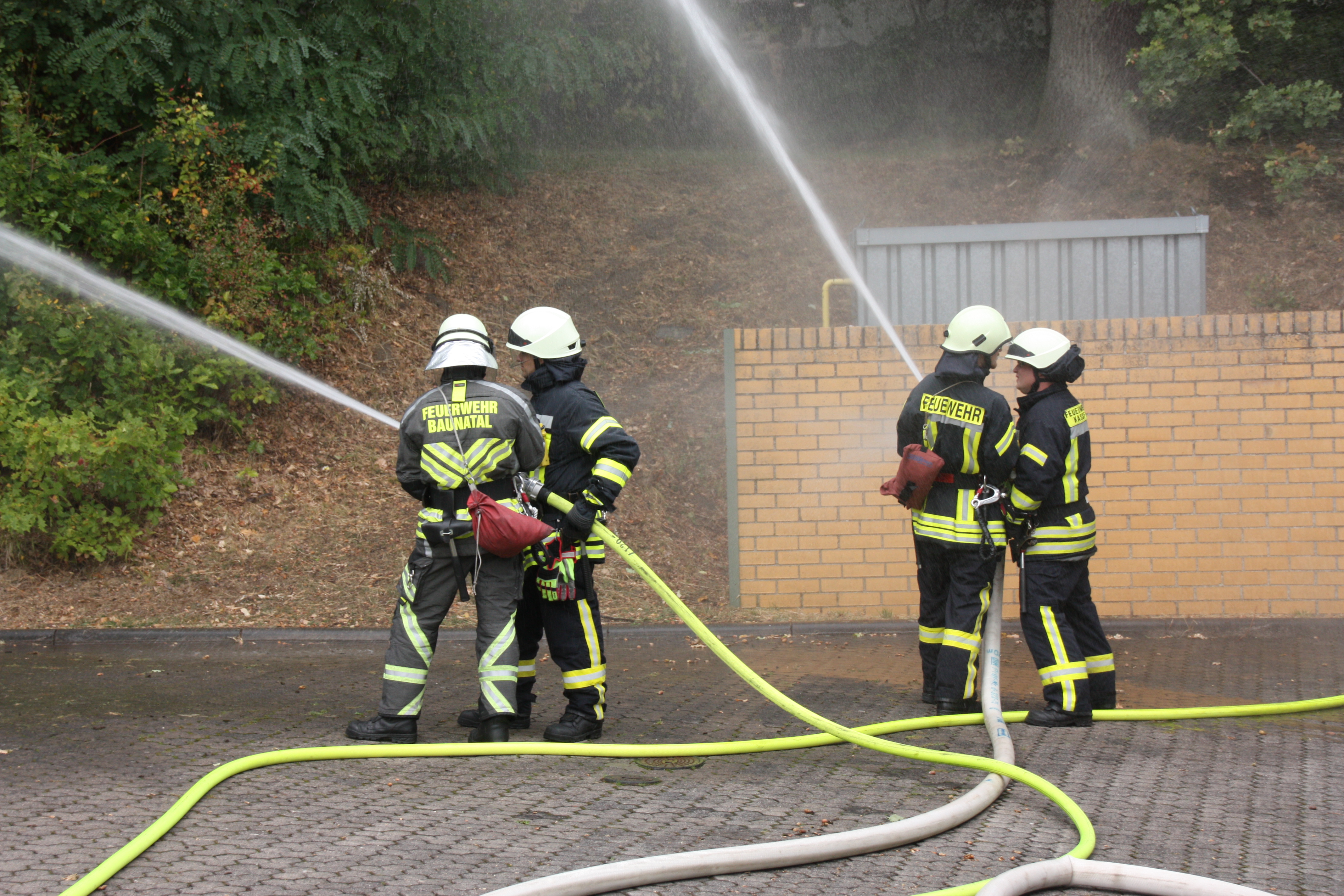 Lehrgangsteilnehmer bei der praktischen Ausbildung. Vornahme von Strahlrohren zur Brandbekämpfung.