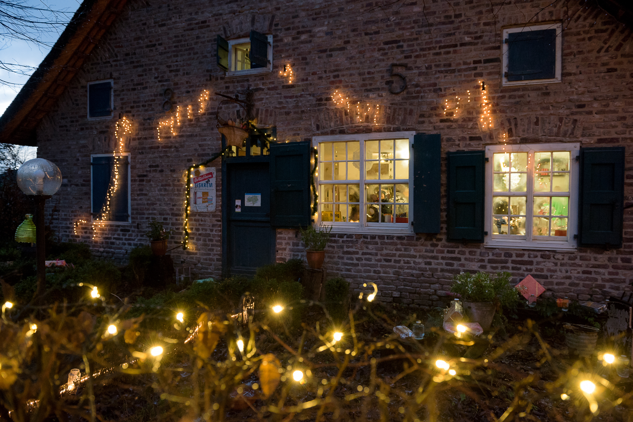 Zahlreiche Lichtquellen - wie hier am Tante-Emma-Laden - verwandeln am ersten und zweiten Adventswochenende das Niederrheinische Freilichtmuseum in den Romantischen Weihnachtsmarkt. Foto: Frank Hohnen / Abdruck honorarfrei