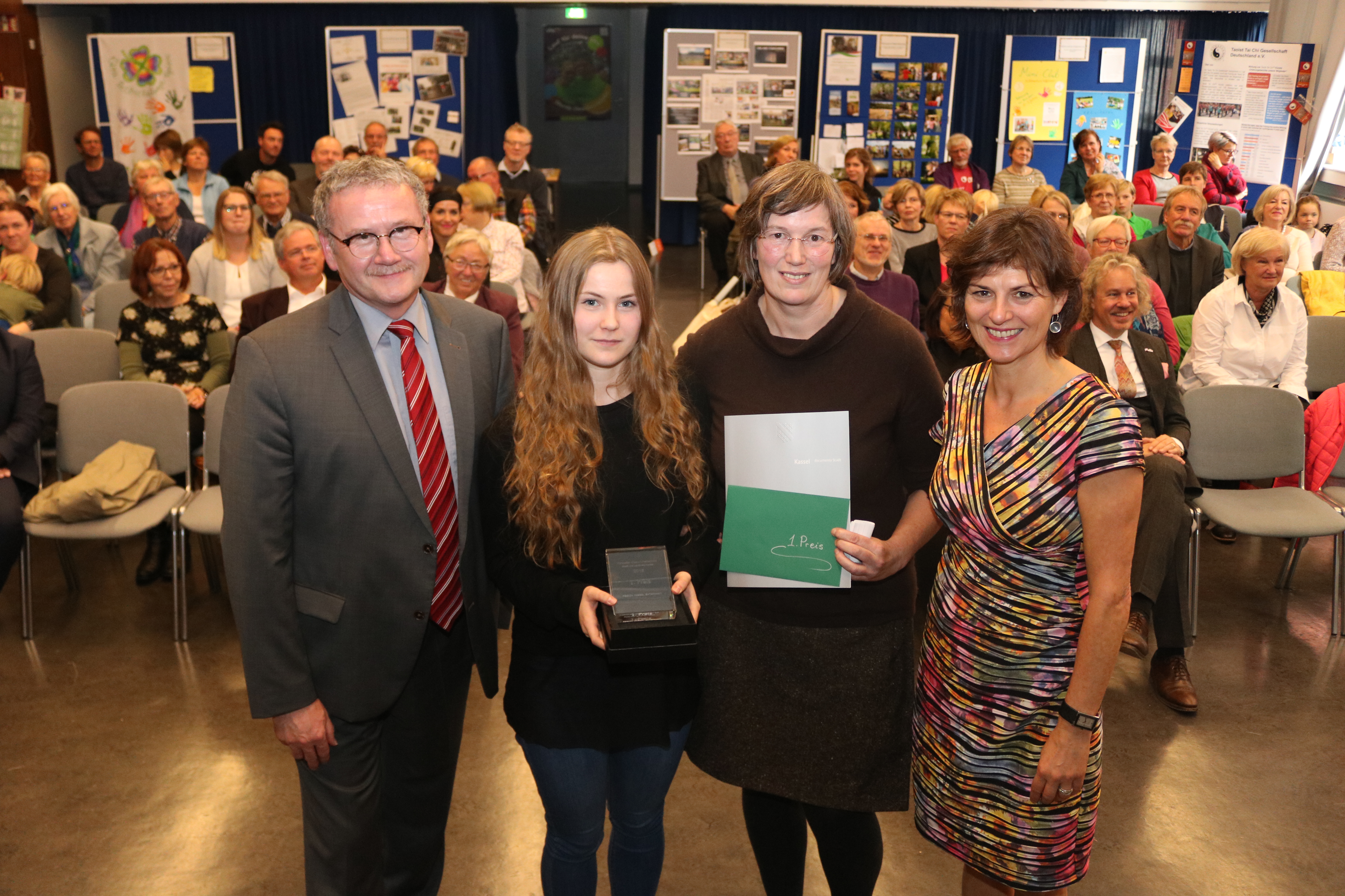 Gesundheitsdezernentin Anne Janz (rechts) und Landrat Uwe Schmidt (links) überreichten Britta Hartmann-Barth (Leiterin des Naturparkzentrums Dörnberg) und Emma Behlke (FÖJlerin) den 1. Preis für das Angebot „Waldbaden“ im Naturpark Habichtswald.