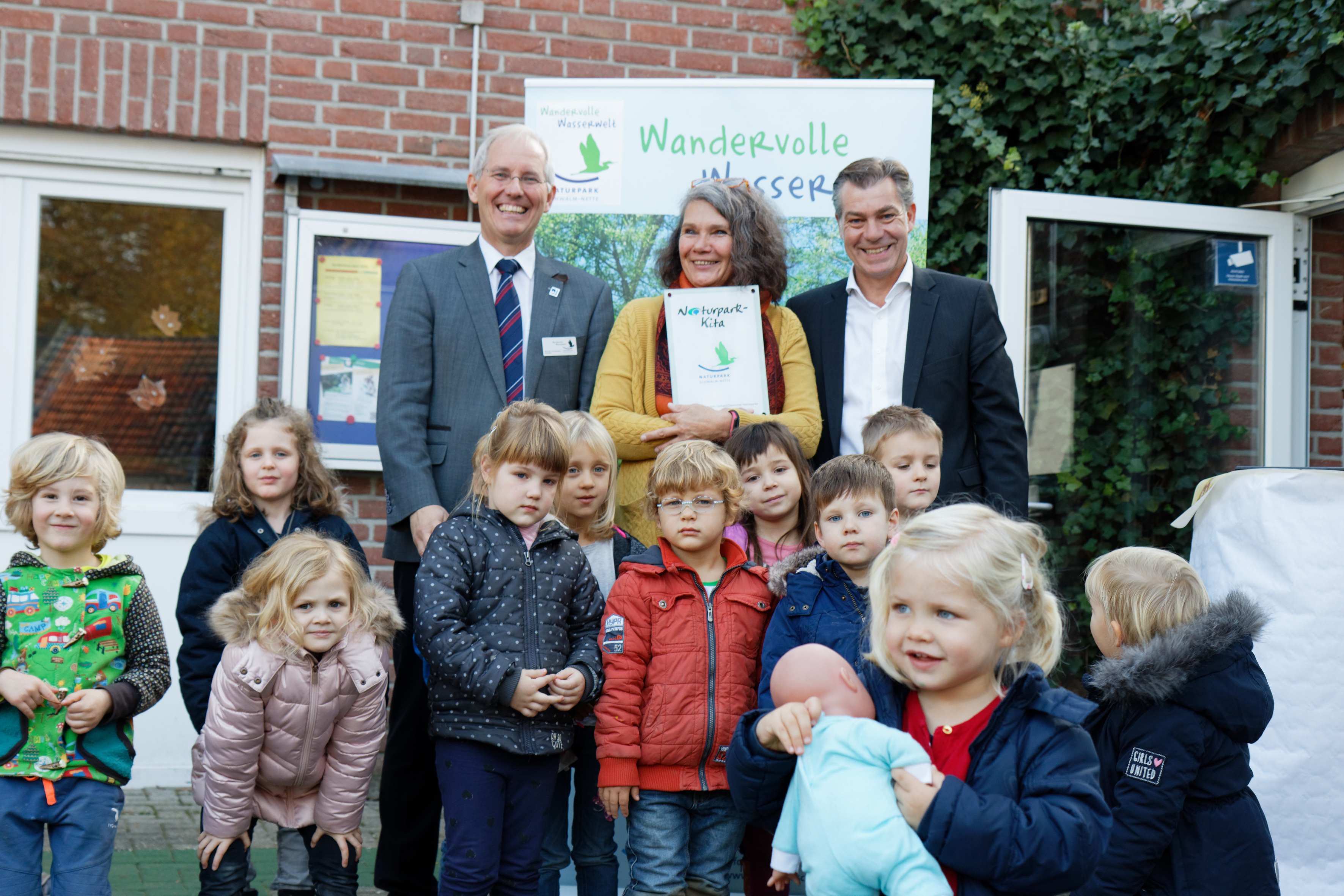 Freuen sich, dass die Kita Vennmühle in Brüggen jetzt offiziell Naturpark-Kita ist: Natupark-Schwalm-Nette-Geschäftsführer Michael Puschmann, Kita-Leiterin Michaela Berndt und Bürgermeister Frank Gellen (v.l.) mit Kindern der Kita. Foto: Naturpark Schwalm-Nette / Abdruck honorarfrei