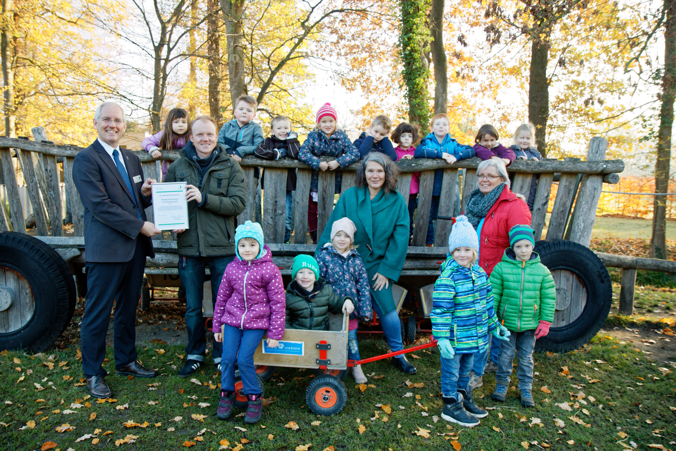 Das Niederrheinische Freilichtmuseum ist neuer Projektpartner des Naturparks Schwalm-Nette bei den Naturpark-Kitas: Michael Puschmann (l.), Geschäftsführer des Naturparks, übergibt die Urkunde an den Museumspädagogen Kevin Gröwig (2.v.l.). Die Mädchen und Jungen des Familienzentrums Vennmühle aus Brüggen mit Leiterin Michaela Berndt (Mitte) und Irene Engels (r.) besuchten das Programm "Daheim am Niederrhein". Foto: Naturpark Schwalm-Nette / Abdruck honorarfrei