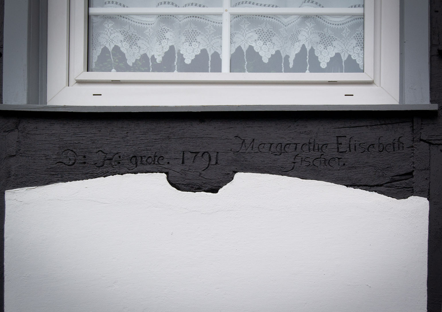 Inschrift aus dem 18. Jahrhundert im Balken über dem Tor zur Wirtschaftsdiele: D.H. Grote 1791 Margarete Elisabeth Fischer.