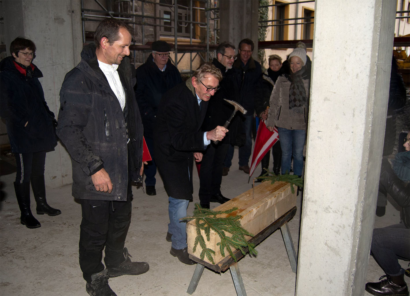 Dem Richtspruch durch Dachdeckermeister Jens Hilker folgte das symbolische Einschlagen des Zimmermannnagels durch Bürgermeister Dr. Peter Paul Ahrens.