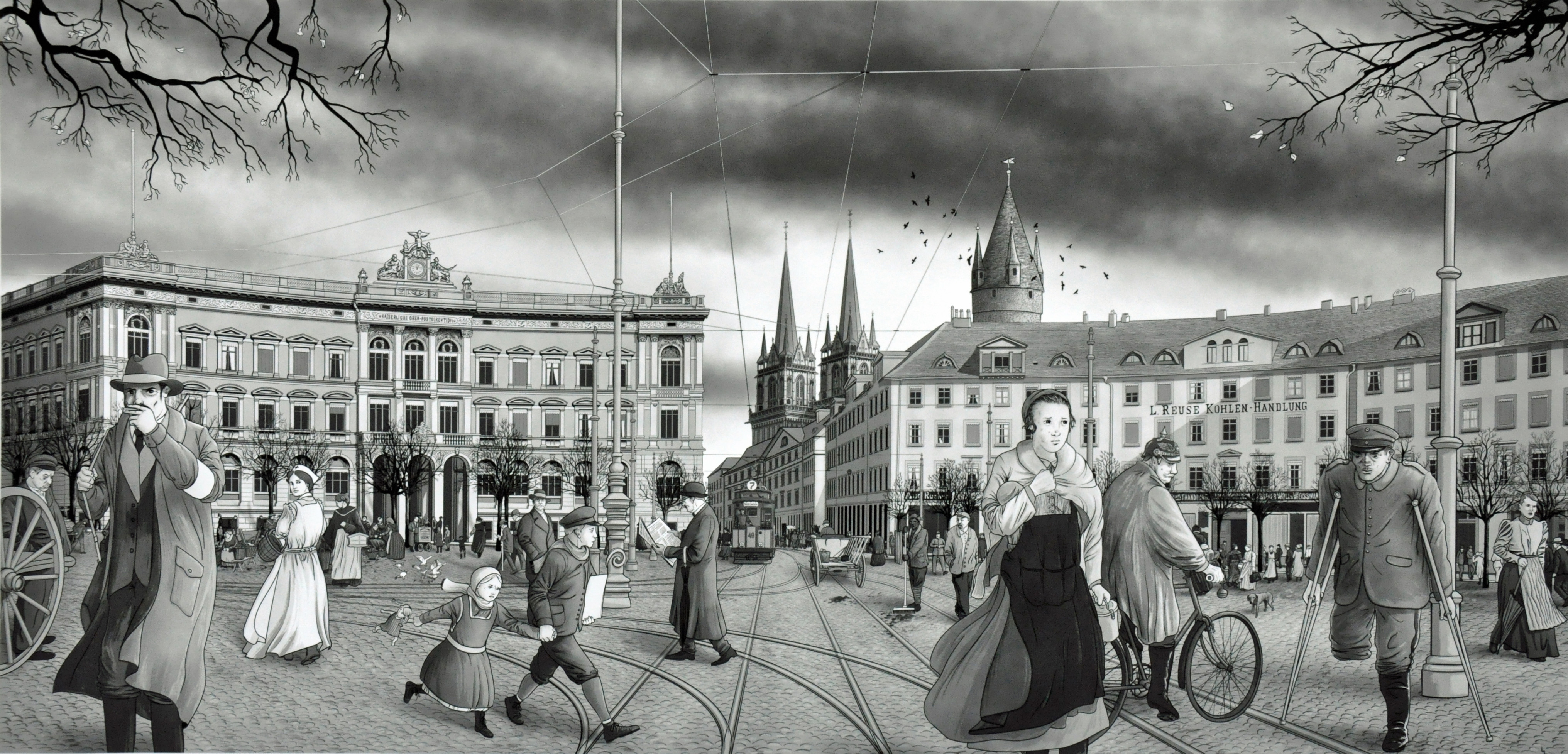Das Bild zeigt das große Wandgemälde "Dezember 1918 auf dem Königsplatz“ des Kasseler Künstlers Steve Marshall in der Ausstellung im Stadtmuseum.