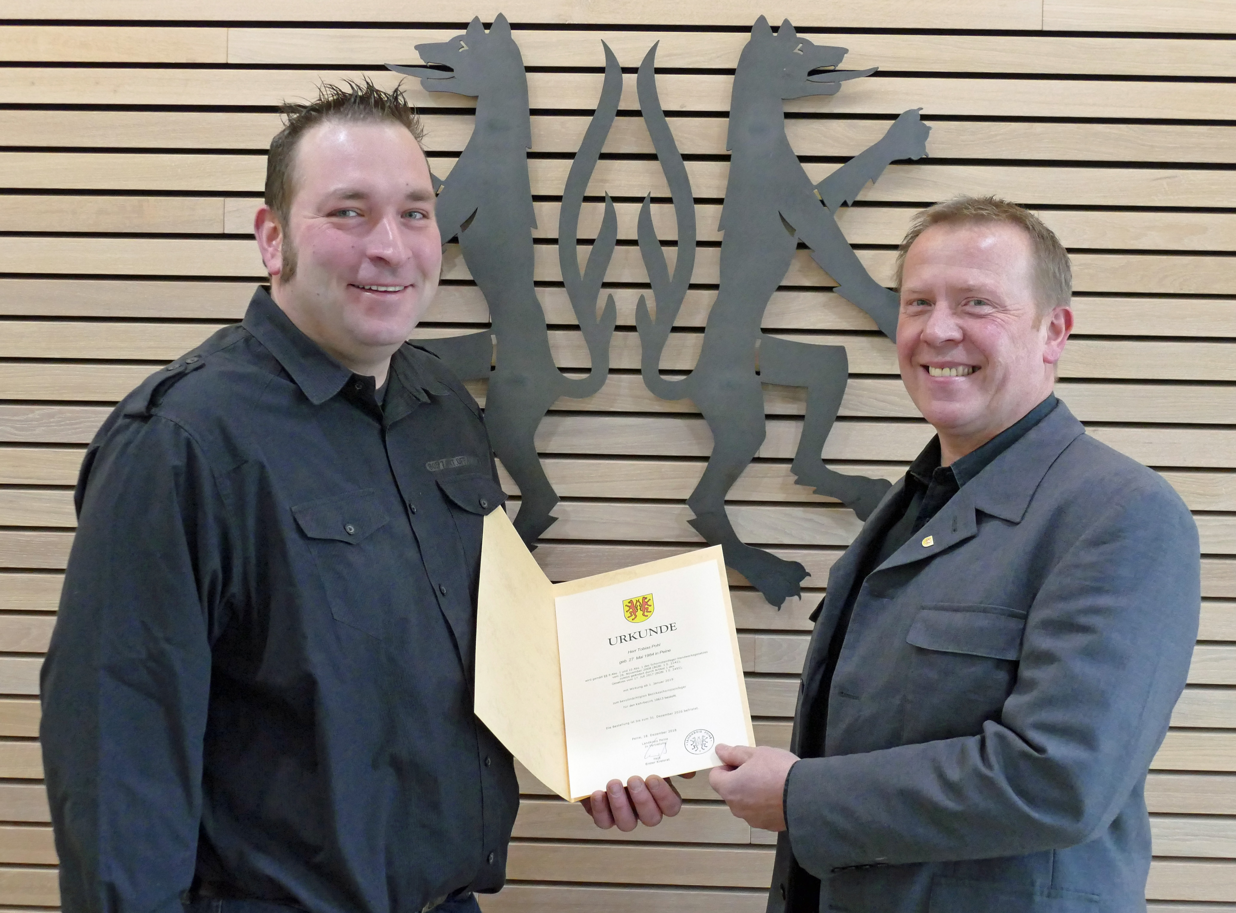 Tobias Pohl (links) wurde am Dienstag zum bevollmächtigten Schornsteinfeger für den Kehrbezirk 10613 bestellt. Dirk Hornemann, Leiter des Fachdienstes Ordnungswesen beim Landkreis Peine, überreichte ihm die dazugehörige Urkunde.