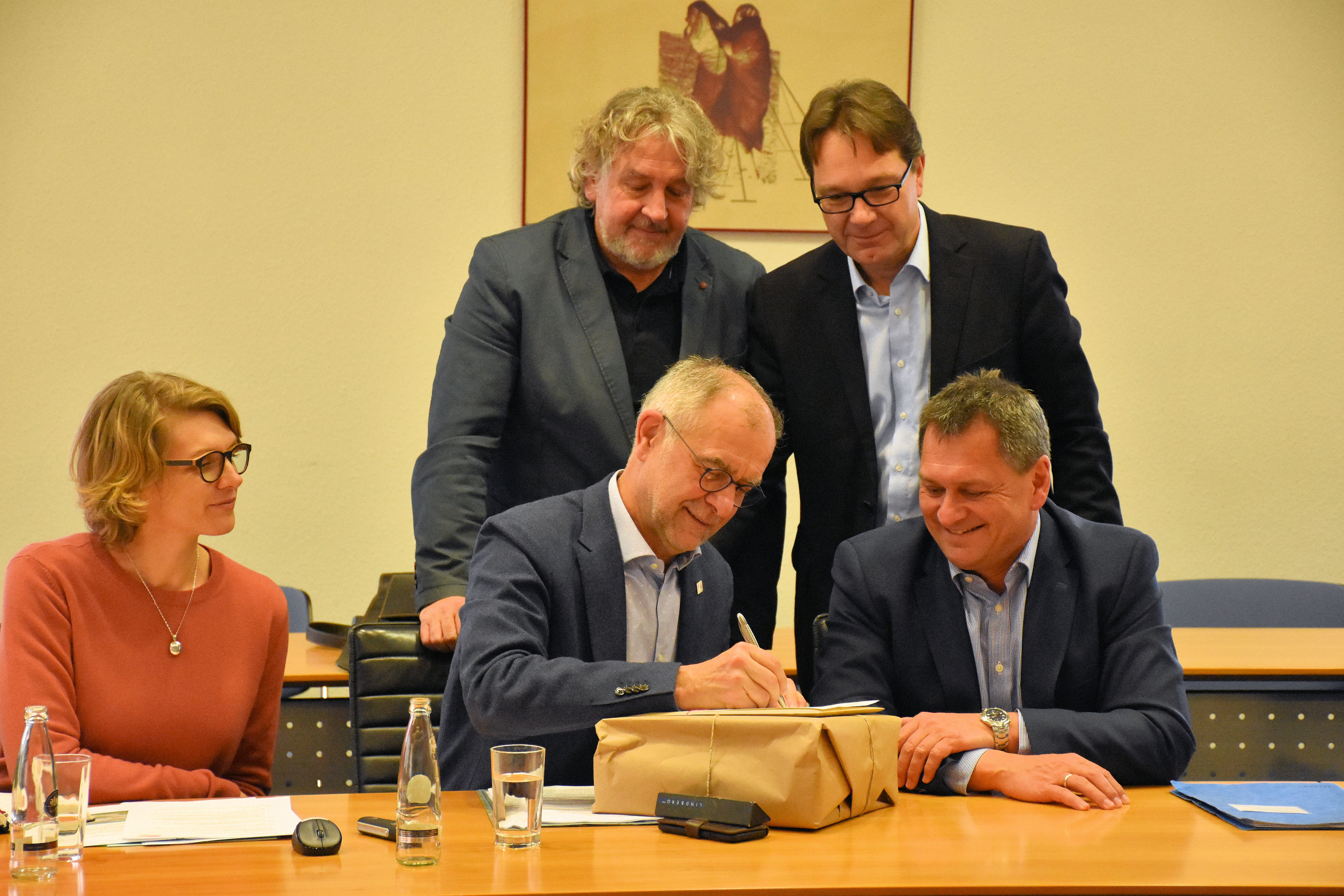 Bürgermeister Wolfgang Stein (vorne rechts) übergab dem stellvertretenden Vorstandsvorsitzenden Harald Freund die Baugenehmigung für das „Warema Sun Forum“. Gemeinsam mit der Leiterin der Unternehmenskommunikation Lilli Heyer, Wertheims Baudezernent Armin Dattler sowie Wirtschaftsförderer Jürgen Strahlheim hatten sie zuvor die neuesten Ansiedlungspläne der Warema Renkhoff SE vorgestellt. Foto: Stadt Wertheim