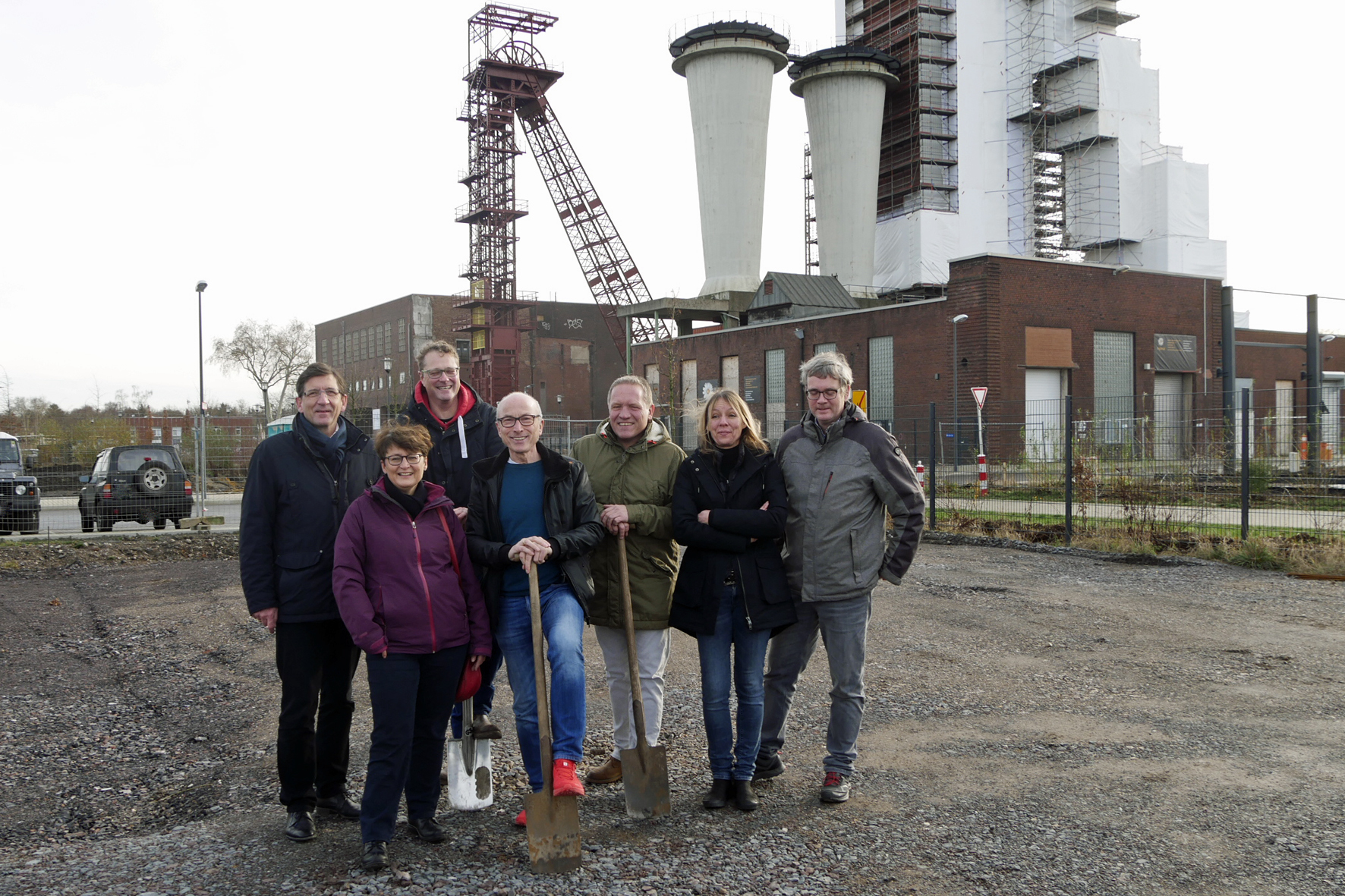 v.l.n.r. Michael Blume sowie Frauke Wiering (Wirtschaftsförderung), Dirk Krühler (Geschäftsführer „KW Konzept“), Bürgermeister Fred Toplak, Jochen Wleklik (Geschäftsführer „KW Konzept“), Andrea Liersch (Architektin) und Benedikt Schmoll (Geschäftsführer EGSE) beim Spatenstich auf Schlägel & Eisen.