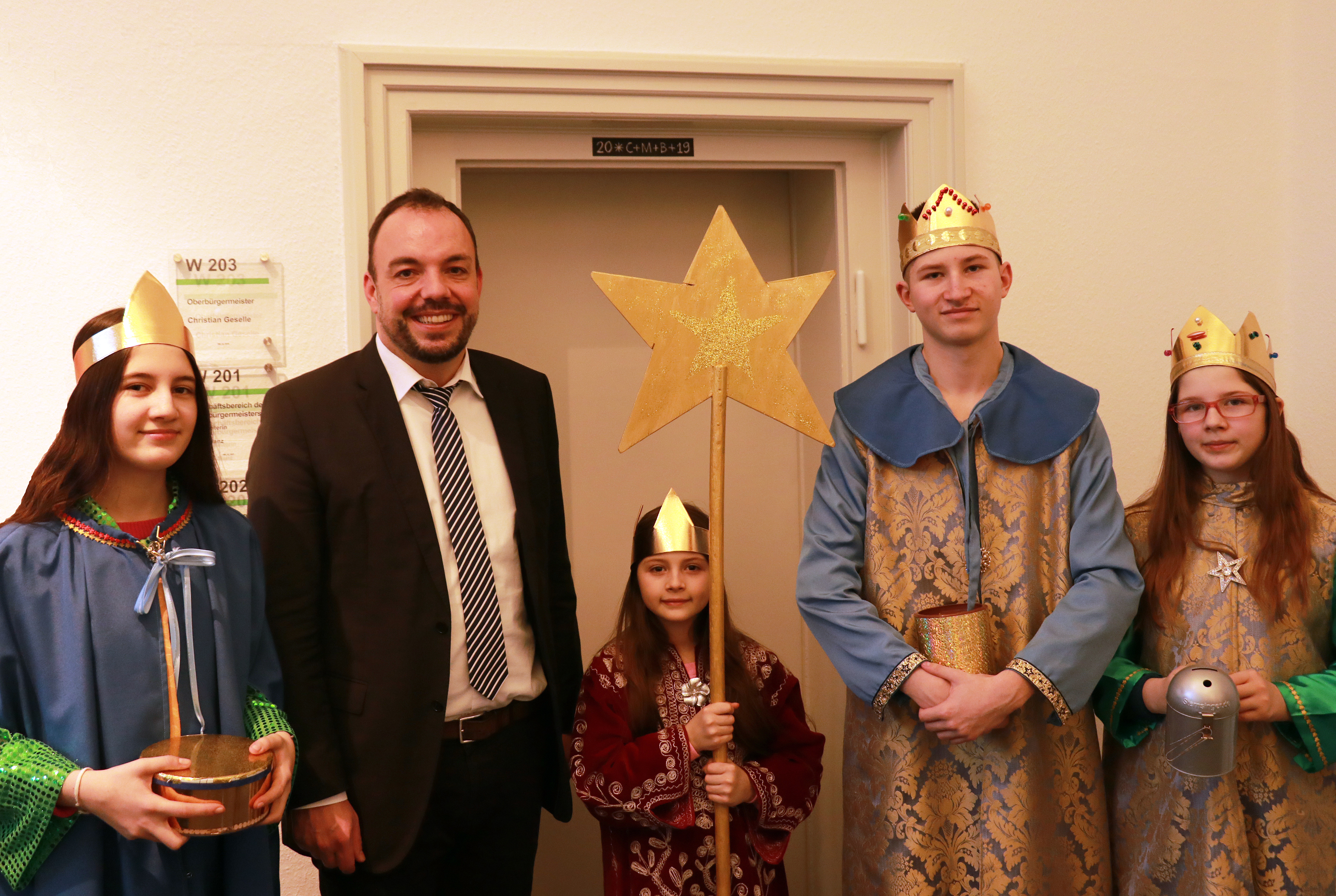 Das Bild zeigt von links Isabella, Oberbürgermeister Christian Geselle, Stella, Leon und Angelina