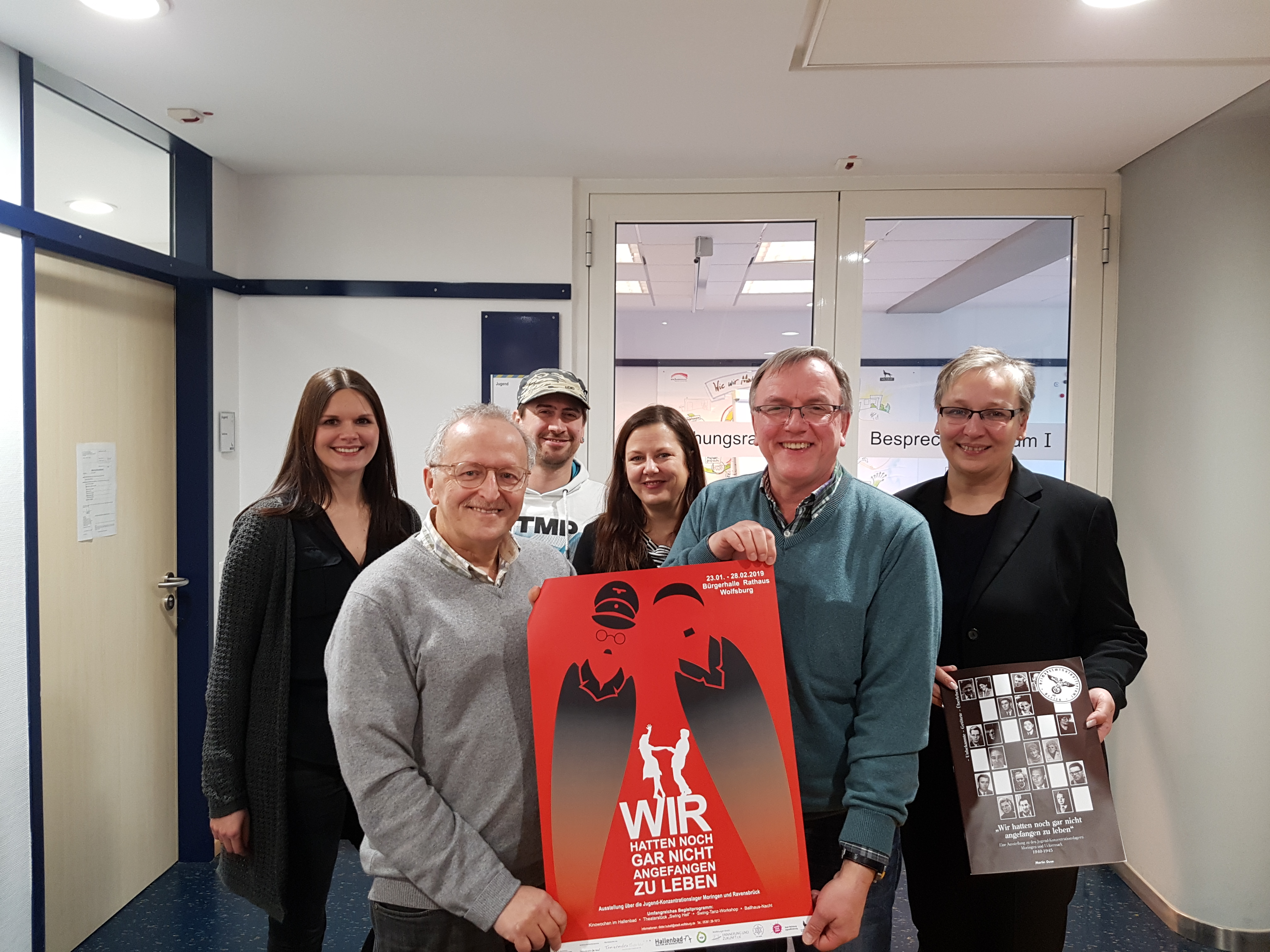 Jennifer Zwerner (Tanzendes Theater Wolfsburg; v.l.), Dimitri Tukuser (Liberale Jüdische Gemeinde), Lars Hung (Hallenbad, Zentrum junge Kultur), Katharina Varga (Leiterin Geschäftsbereich Jugend), Dieter Kuball (Jugendförderung Stadt Wolfsburg) und Iris Bothe (Dezernentin für Jugend, Bildung und Integration) präsentieren die Ausstellung „Wir hatten noch gar nicht angefangen zu leben“.