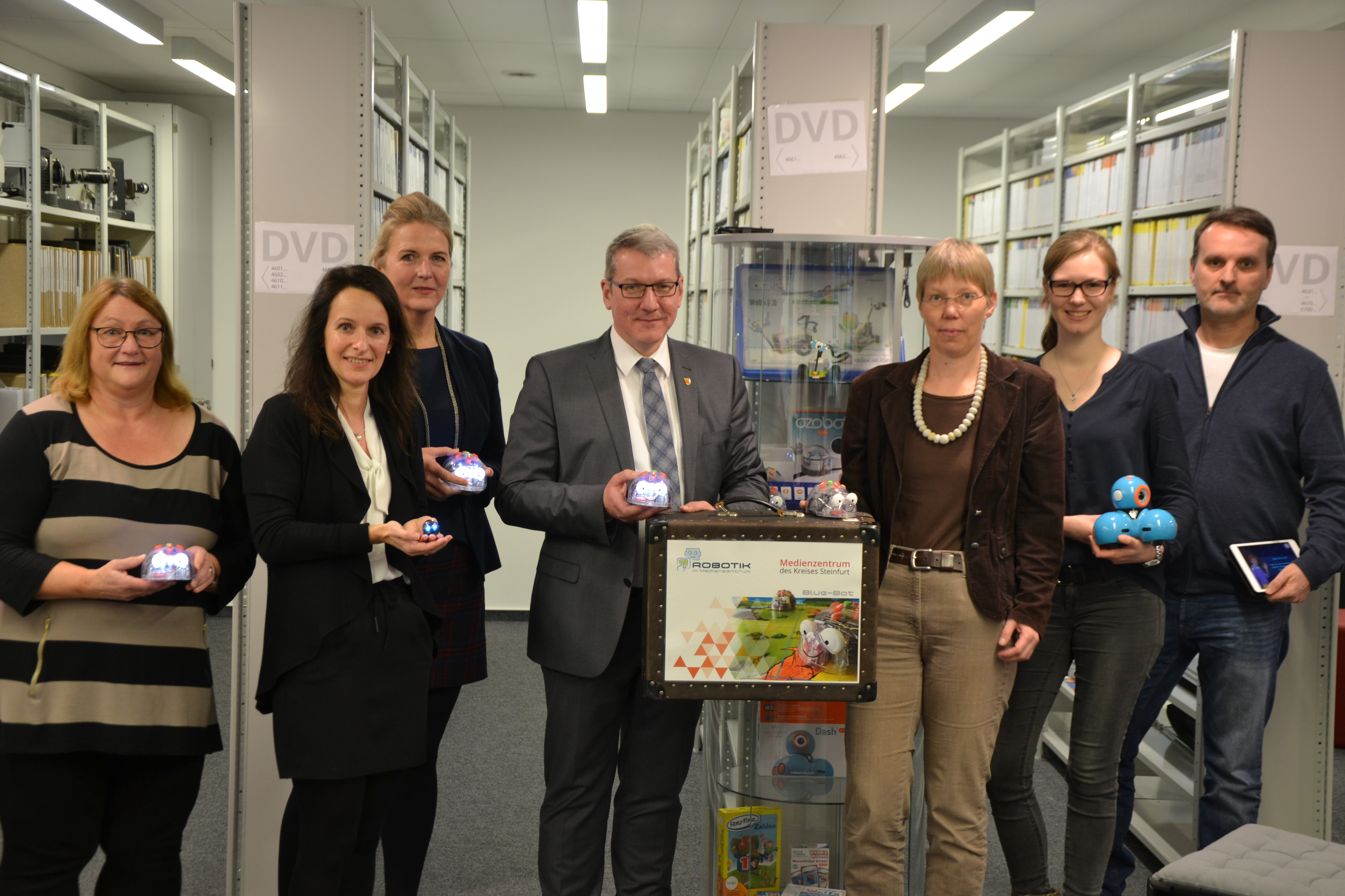Freuen sich über den digitalen Zuwachs im Medienzentrum des Kreises Steinfurt (v. l.): Eleonore Giehler (Medienzentrum Kreis Steinfurt), Gabi Wenke (zdi-Zentrum Kreis Steinfurt), Birgit Neyer (Geschäftsführerin WESt) und Landrat Dr. Klaus Effing sowie Sonja Bruns (Leiterin Schul-, Kultur- und Sportamt des Kreises Steinfurt), Linda Wiechers (zdi-Zentrum Kreis Steinfurt) und Stefan Heerdt (Medienzentrum Kreis Steinfurt).