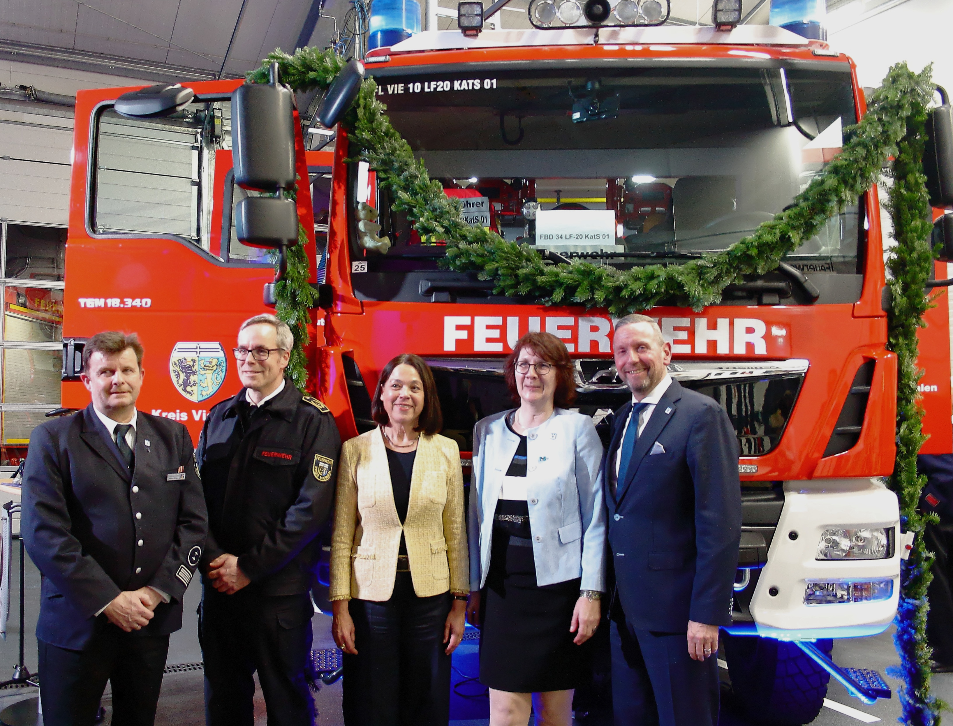 Freuen sich über ein neues Fahrzeug für die Brandbekämpfung im Katastrophenfall und im Feuerwehr-Alltag: (v.l.) Löschzugführer Robert Delvos, Kreisbrandmeister Rainer Höckels, Gesundheitsdezernentin Katarina Esser (Kreis Viersen), Feuerschutz-Dezernentin Brigitte Schwerdtfeger (Stadt Willich), stv. Bürgermeister Guido Görtz (Stadt Willich). Foto: Lars Greiner, Feuerwehr Willich / Abdruck honorarfrei