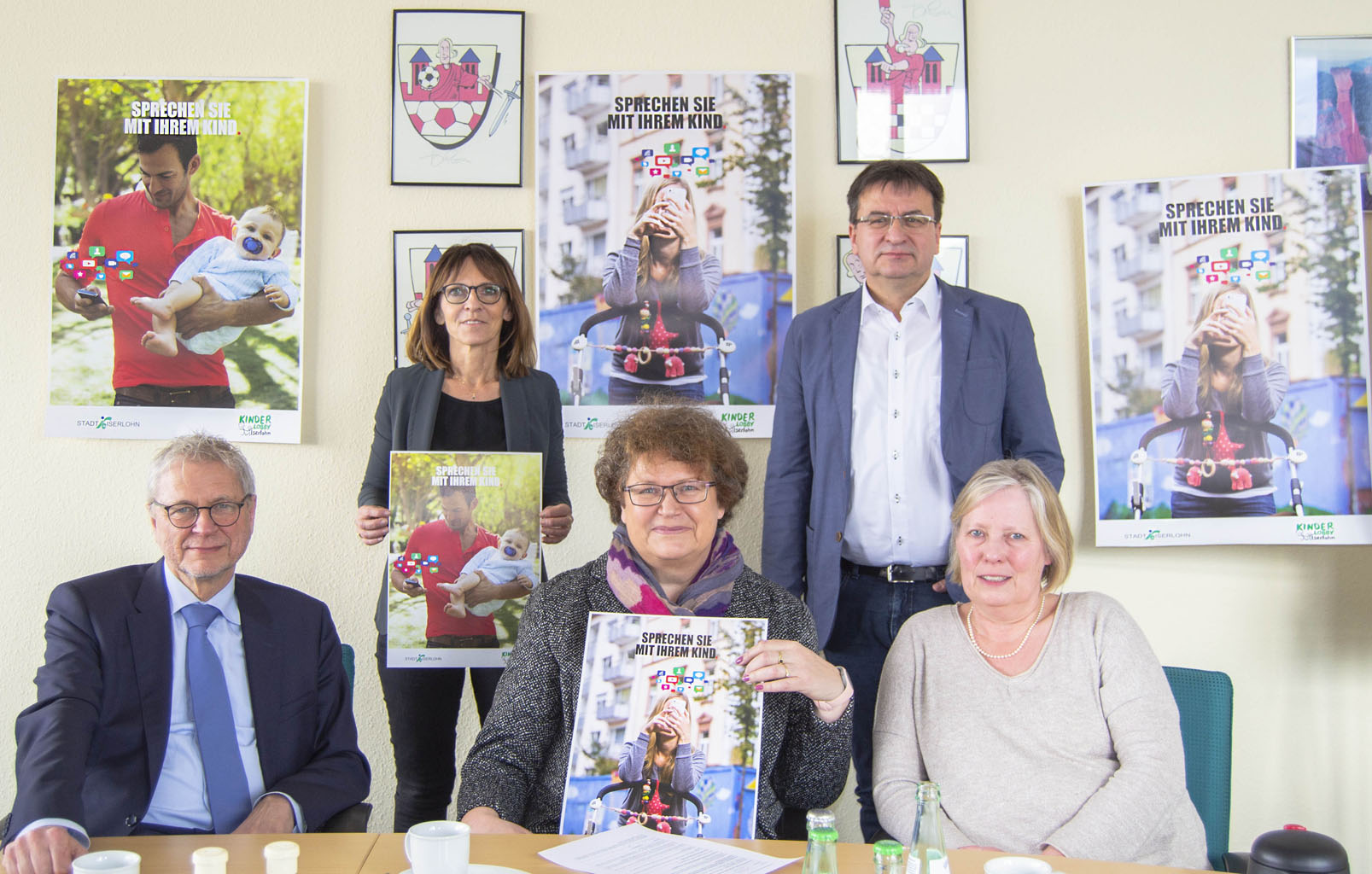Jürgen Schwerter, Monika Körner-Weinert und Sabine Nölle von der Kinderlobby (vorne, v.l.) sowie Sabine Menzel vom Familienbesuchsdienst und Jugendamtsleiter Kai Maibaum stellten die Plakataktion “Sprechen Sie mit Ihrem Kind” vor.
